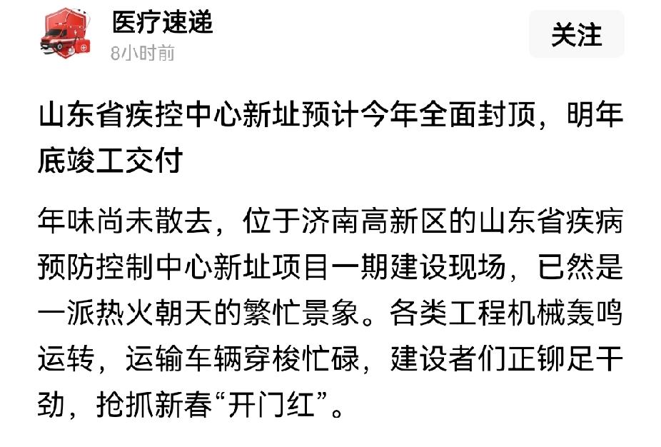 山东省疾控中心封顶了,预计明年年底交付。搬走后原来的地方将会交给千佛山医院。 而济南市疾控中心已经先一步搬走了。目前济南市疾控中心已经从经一纬六搬到了济南国际医学中心,原来的地址交给济南市第二医院。 而山东省疾控中心则搬到了高新东区(孙村片区),大正路以东,山东职业学院以南。 省市两级疾控中心都搬离主城区,一个搬到东边,一个搬到西边,原来的办公地点则交给了医院,也挺有趣的。