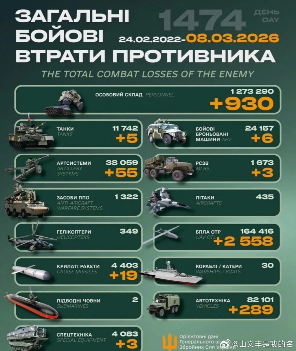 乌俄战争进入第1474天,乌克兰总参谋部发布战报:过去24小时乌俄双方交战97次,其中25次在胡利亚伊波列(12次在苏梅)、25次在托列茨克、8次在莱曼、24次在波克罗夫斯克、3次在南顿涅茨克区域。毙伤俄930名。俄军累计损失1273290人。摧毁俄5辆坦克、6辆装甲车、55门火炮、3个火箭发射装置、2558架大型无人机、289辆军车、3件特种设备、19枚导弹。