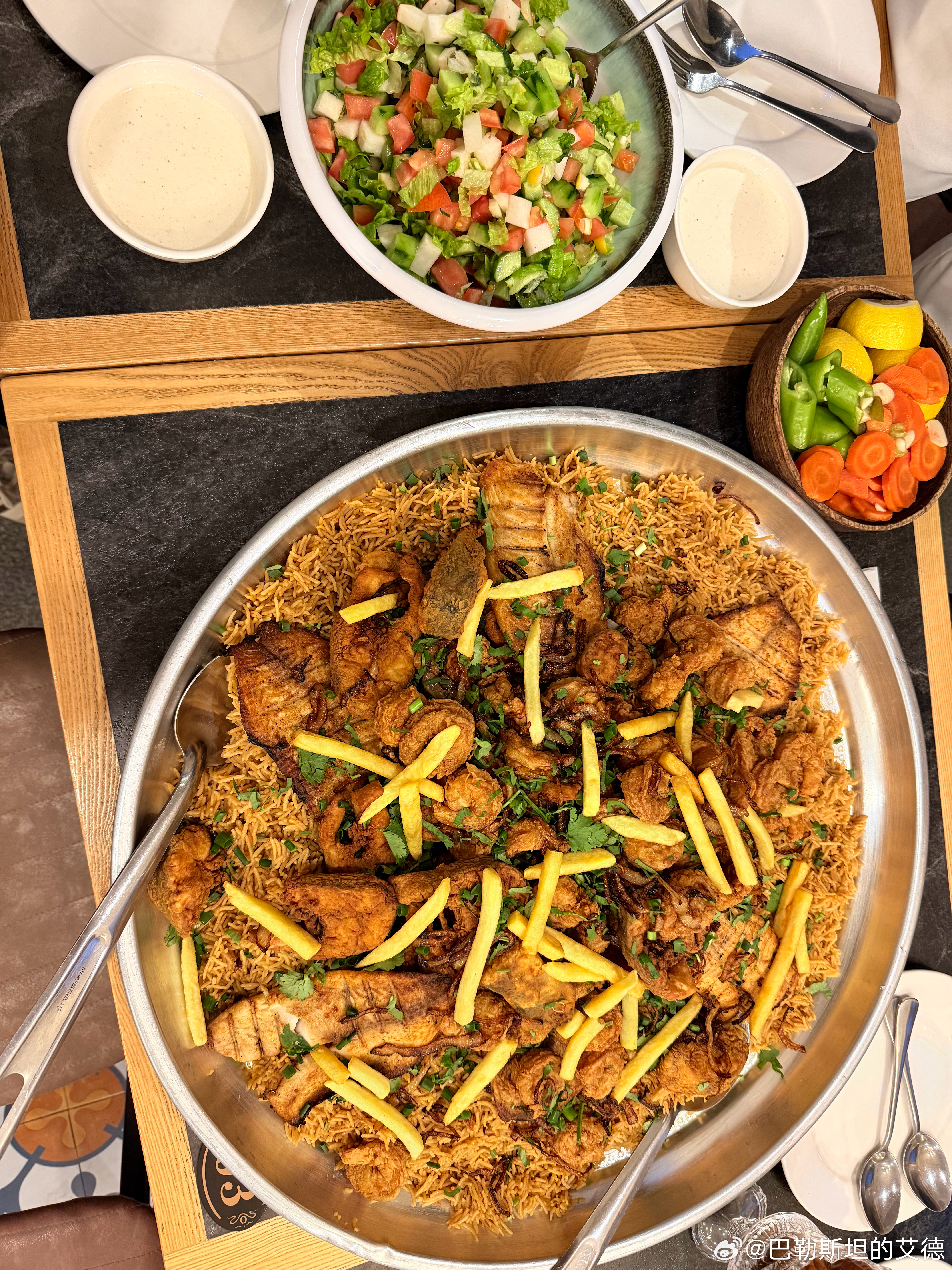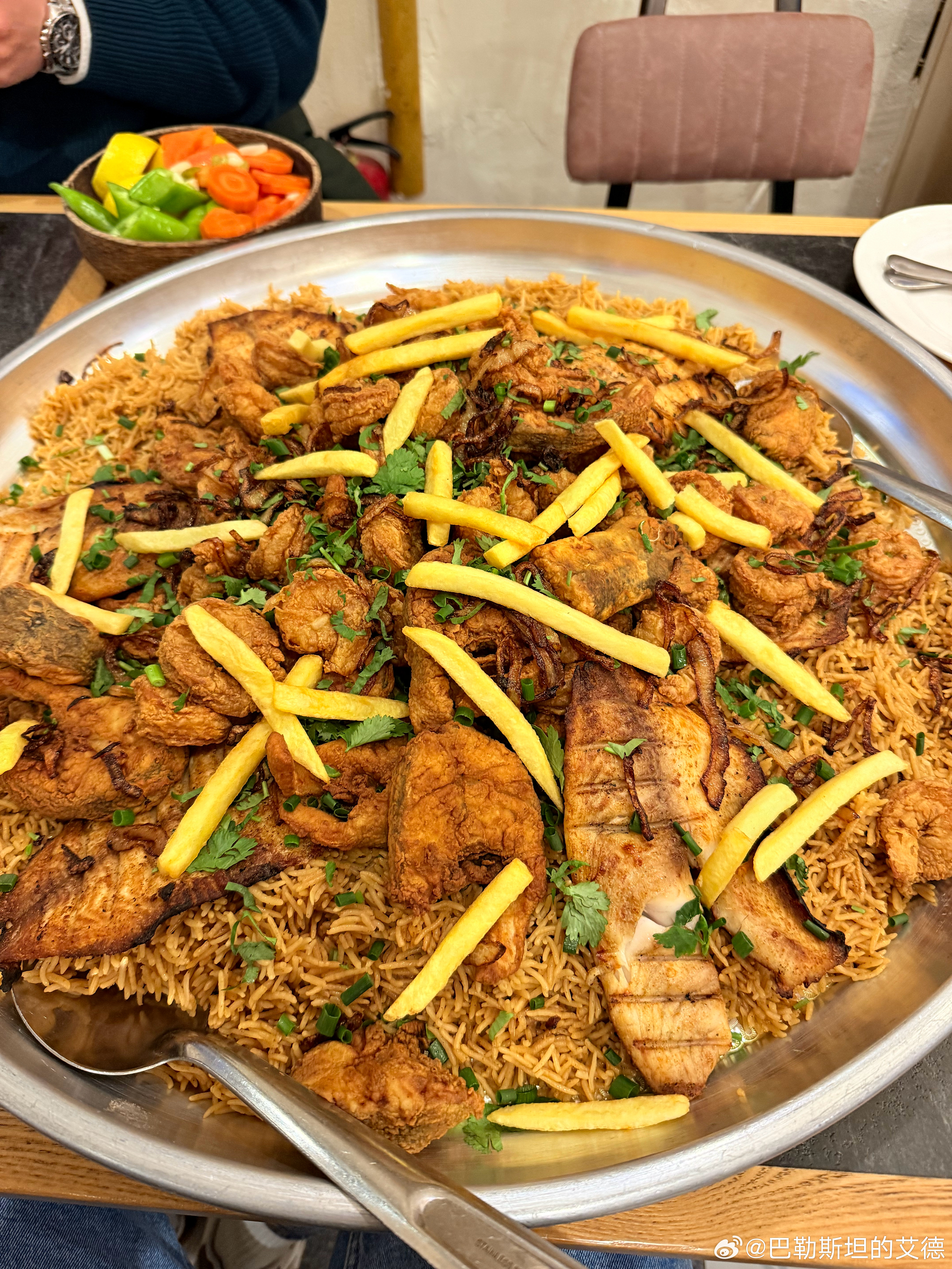 🟥斋月第十九天~一道来自巴勒斯坦沿海城市的传统美食,如Gaza、Acre和Jaffa。主要食材是新鲜的鱼、大米和洋葱。先把鱼煎好。再把洋葱炒到颜色变深。然后用鱼汤和香料煮米饭。把米饭盛在大盘中。把鱼摆在米饭上面。通常搭配芝麻酱或沙拉一起食用。这道菜与巴勒斯坦海岸渔民的生活密切相关。名字来自“渔夫”这个词。它体现了巴勒斯坦饮食的简单与对海洋资源的依赖。伊朗亮底线西班牙伊朗公布向美军航母发射导弹视频