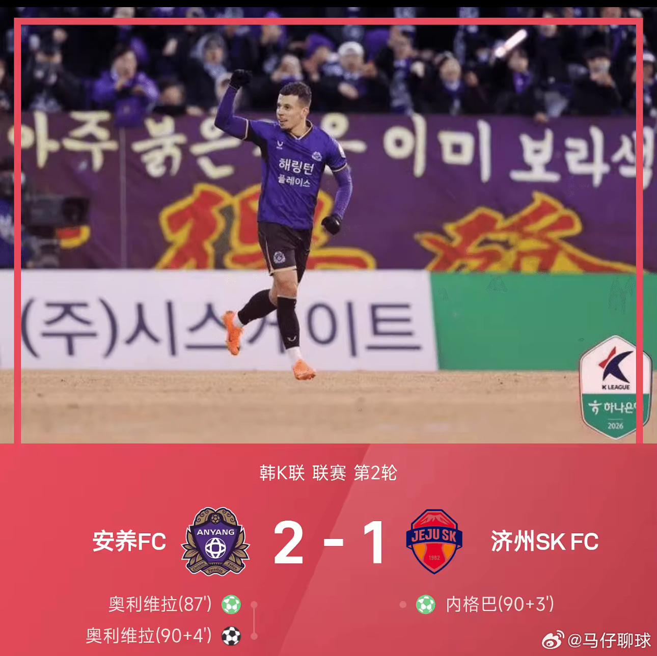 03月08日讯 26赛季韩K联联赛第2轮,安养FC2-1战胜济州SK FC。上半场,两队均无进球良机;下半场,奥利维拉单刀突入禁区推射击中立柱,随后依靠点球,奥利维拉为安养打破僵局,补时第3分钟,内格巴同样利用点球为济州SK扳平,补时第4分钟,奥利维拉完成绝杀,安养FC最终2-1击败济州SK。韩k联赛足球