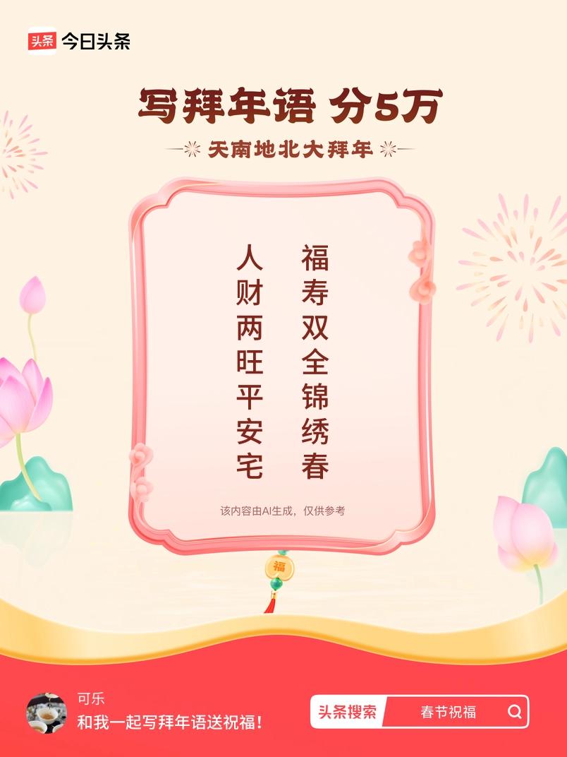 写拜年语送祝福新春拜年送祝福!我的祝福是:“人财两旺平安宅,福寿双全锦绣春”!快来一起写祝福吧戳这里,一起领红包>