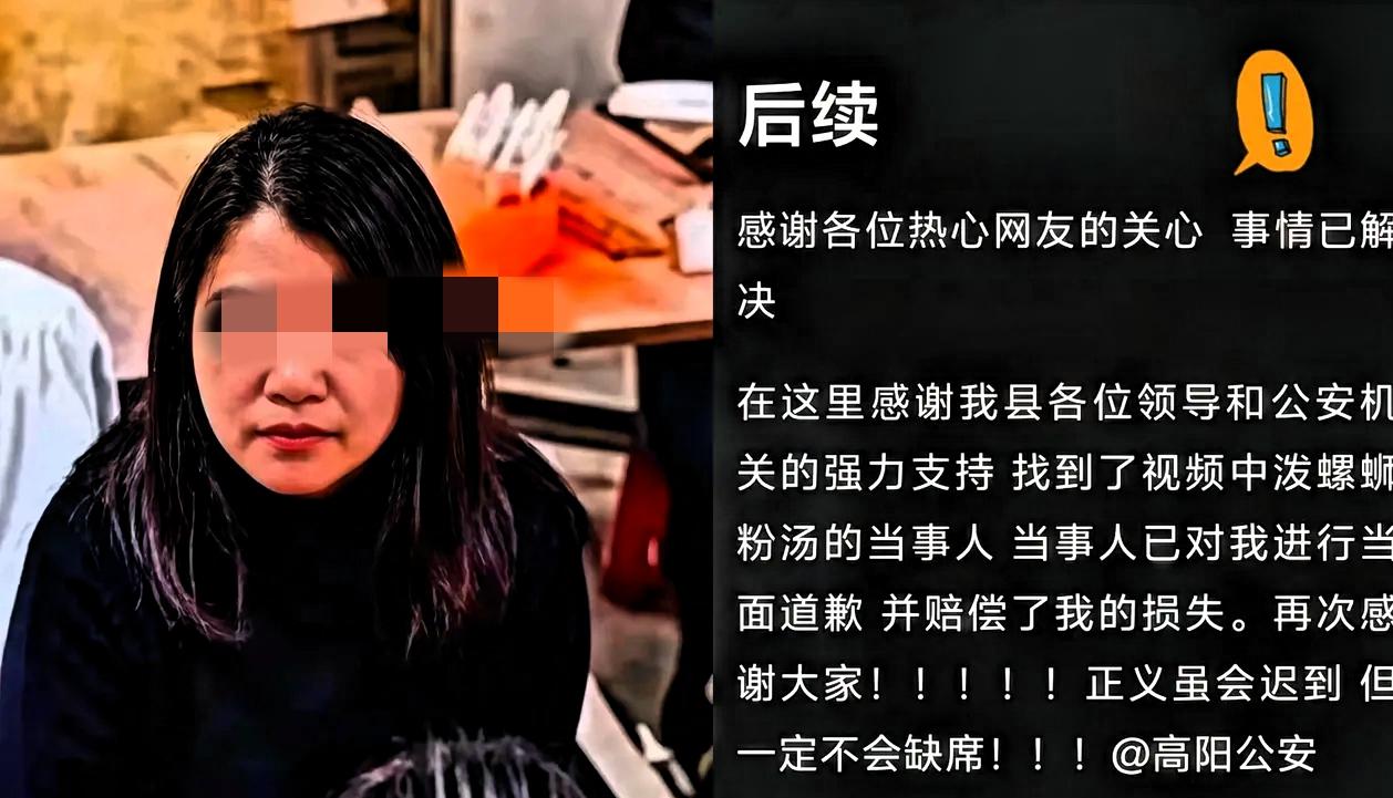 那不可一世的泼汤女,终于还是低头了。 不少人认为她是认识到错误、真心悔改,但从整个过程来看,她的妥协更多是迫于舆论与处理结果的压力,而非自发反省。 此前在公共场合,因小事引发争执,女子行为过激,给对方造成了困扰与伤害,当时并未表现出歉意。随着视频传播范围扩大,社会关注度提高,高阳警方介入处理后,她才主动提出赔偿并道歉,希望事件尽快平息。 她真正在意的,并非自己对他人造成的伤害,而是事件持续发酵对自身生活、声誉带来的负面影响。这种低头,是为降低个人代价做出的选择,并不代表真正理解了尊重与礼貌的意义。 公共空间中,人与人之间难免产生小摩擦,理性沟通、互相包容才是解决问题的合理方式。冲动行事不仅会伤害他人,也会让自己承担相应后果,等到局面难以控制再补救,往往于事无补。 一个人的教养,体现在情绪来临时能否克制,犯错后能否真诚反思,而不是有利时嚣张、承压时妥协。尊重他人,遵守公序良俗,不仅是维护公共秩序,也是对自己的负责。 遇事少一点戾气,多一点理性,才能避免小事变大事。这件事也提醒大家,出门在外谦和有礼,才能减少矛盾,让生活更平和。