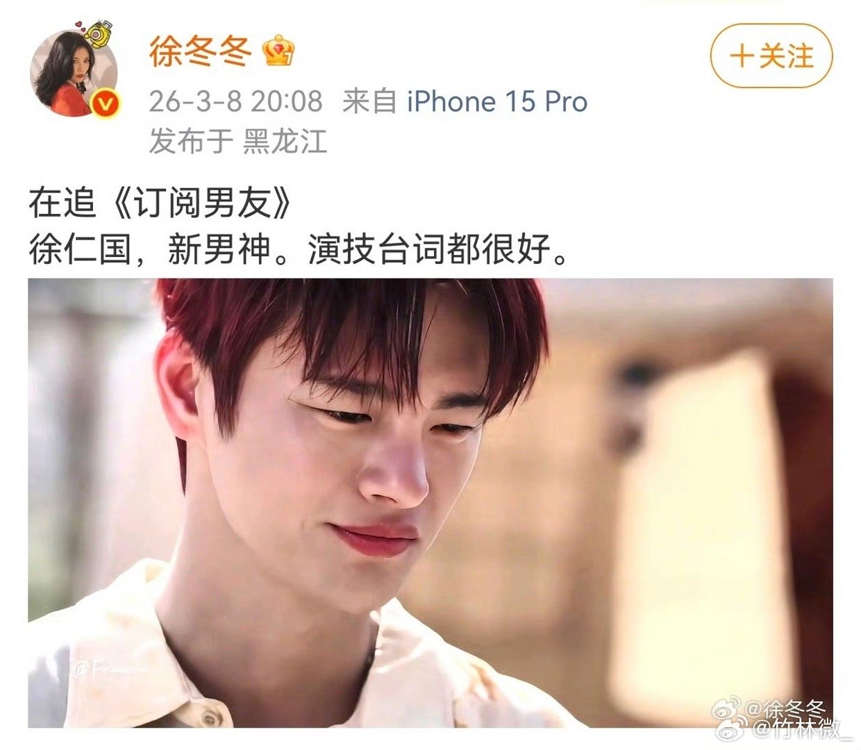 徐冬冬还是拒绝不了痞帅脸徐冬冬看《订阅男友》看入迷了,直接粉上徐仁国,说他演技台词都不错。发现他跟尹子维长得有点像,看来她就喜欢痞帅型的。