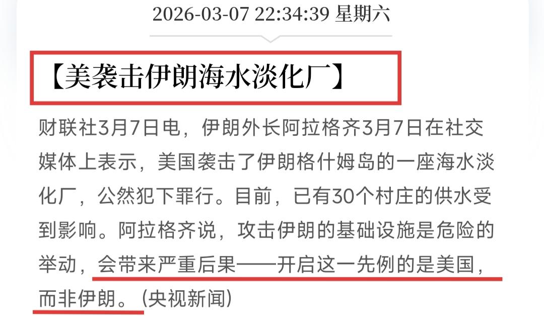 战争有失控的迹象!两边都开始攻击民用设施,油价压不住了。 昨晚,美国轰炸了伊朗南部的一座海水淡化厂,导致附近30个村庄出现缺水情况。 伊朗外长警告称:记住——开启这一先例的是美国,而非伊朗。 现在的局面已经不是单纯的军事对抗了,双方都在往长期战争铺路,而且下手越来越狠,开始针对性攻击民用设施。以色列80多架战机轮番空袭伊朗,名义上打军事目标,可实际上伊朗红新月会统计,已经有6600多处民用设施被炸,包括学校、医疗中心,还有关系民生的海水淡化厂。 而伊朗的反击,也直接瞄准了美以的储油罐、炼油厂,连沙特、卡塔尔这些没直接参战的国家,相关设施也没能幸免。 这就直接戳中了全球能源的命门——中东是世界产油重地,而霍尔木兹海峡更是“世界油阀”,全球五分之一的海运石油都从这里过。现在战火蔓延,阿联酋、科威特已经开始预防性减产,科威特甚至直接说遭遇“不可抗力”,先缩减产量避险。 摩根大通的测算很直白:要是波斯湾的储油罐装满了,或者霍尔木兹海峡一直封着,中东原油减产规模很快会突破每天400万桶,甚至接近600万桶。 油价上涨不是说说而已,现在布伦特原油已经涨到近93美元一桶,创了两年多新高,高盛更是警告,要是下周还没缓和迹象,油价可能突破100美元,甚至追上2008年的峰值。有人可能会问,油价涨了,谁最受益?答案很明显——俄罗斯。 以前美国对俄油制裁很严,导致俄油不好卖,现在中东供应出了大问题,美国也松口了,不仅允许印度买俄油,还在考虑全面解禁俄油。俄罗斯本身就有大量待售石油,一旦制裁放宽,正好趁机填补中东减产的缺口,赚足利润,相当于这场中东冲突,间接给俄罗斯送了个“红利”。 石油是“工业血液”,不是只影响加油那么简单。油价一涨,物流运输成本会跟着涨,我们网上买的东西、超市里的蔬菜粮食,运输费都会折算到价格里,最后还是我们买单。 不止如此,塑料、化肥、橡胶这些日常用品的原料,都来自石油。油价飙升,塑料价格已经涨了一成多,轮胎成本也跟着上升,就连新能源汽车,虽然不用油,但它的塑料件、电池电解液,也离不开石油,成本涨幅可能达到15%-25%。农民种地的化肥价格也会涨,粮食成本上升,最终还是会反映在我们的餐桌上。 全球经济也会被拖累,国际货币基金组织测算,油价每涨10美元一桶,全球物价就会涨0.3-0.7个百分点,经济增速还会放缓。对我们普通人来说,工资没怎么涨,物价却一个劲往上走,压力只会越来越大。 那普通人能做什么?别想着靠个人改变油价,不现实。最实际的,就是想办法补贴家用,油价涨,能源板块大概率会受益,比如石油开采、炼化相关的企业,还有军工、黄金这些避险板块,也会因为地缘冲突被资金关注。 当然,股市有风险,不能盲目跟风,尽量选稳健的标的,小仓位尝试,目的是对冲物价上涨的压力,而不是一夜暴富。毕竟我们普通人能做的,就是在大环境不好的时候,多找一条增收的小路,尽量减少生活受到的冲击。 说到底,中东的炮火从来都不是孤立的,全球化的今天,没有哪个国家、哪个人能独善其身。这场冲突的走向还不确定,但油价上涨的影响已经开始显现。我们能做的,就是看清趋势,做好应对,在不确定性中,尽量守住自己的小日子。