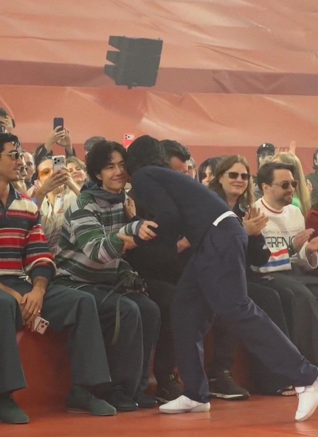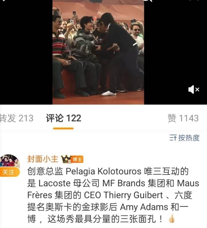 巴黎时装周,Lacoste大秀,王一博在座位上和Lacoste 母公司MF Brands集团和Maus Frères集团的CEO Thierry Guibert热聊。 大秀结束时,创意总监 Pelagia Kolotouros 唯三互动的是这位CEO、六度提名奥斯卡的金球影后 Amy Adams和一博 ,“这场秀最具分量的三张面孔 !” 顶级巨星,顶级待遇,顶级的尊重和喜爱,王一博真亚洲之光。 王一博
