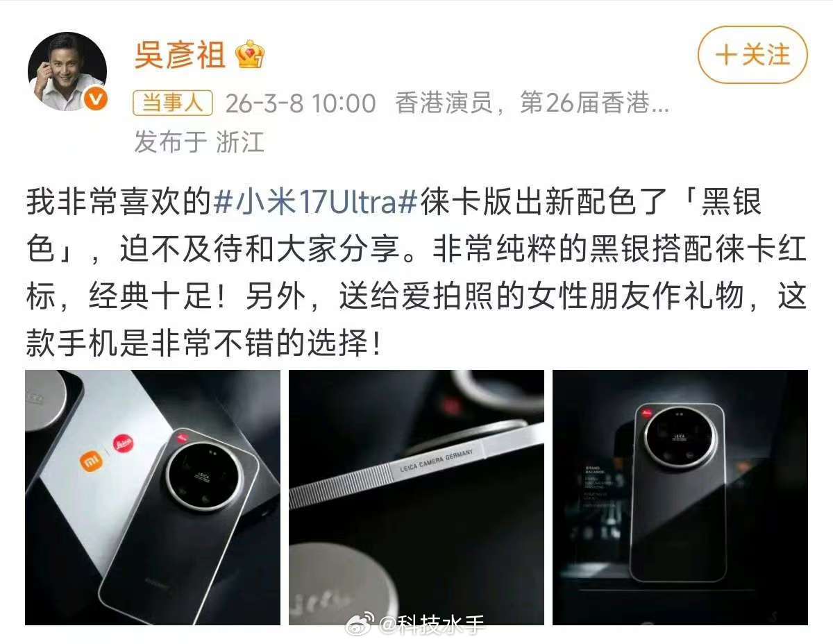 谁能拒绝一台吴彦祖同款的影像旗舰?小米17Ultra徕卡版新配色「黑银色」,纯粹的黑银搭配徕卡红标,辨识度直接拉满。3月10日首销,首发还送小米手环9 Pro+限定手机包,外加碎屏险和只换不修,这波福利太香了。徕卡镜头+复古色彩,随手一拍都是大片,摄影爱好者狂喜。吴彦祖开箱小米17Ultra新配色