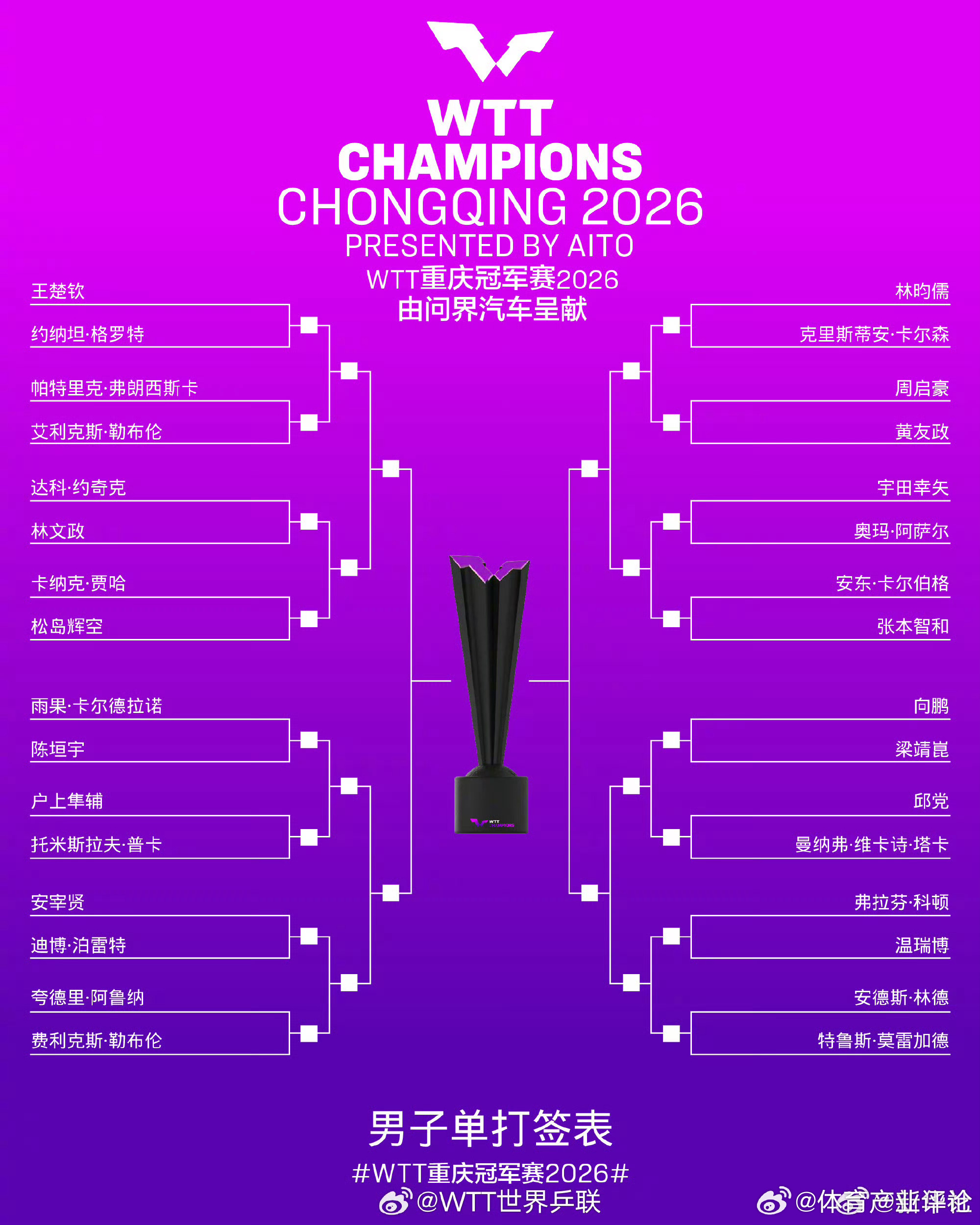 王楚钦拍签表WTT重庆冠军赛签表来了