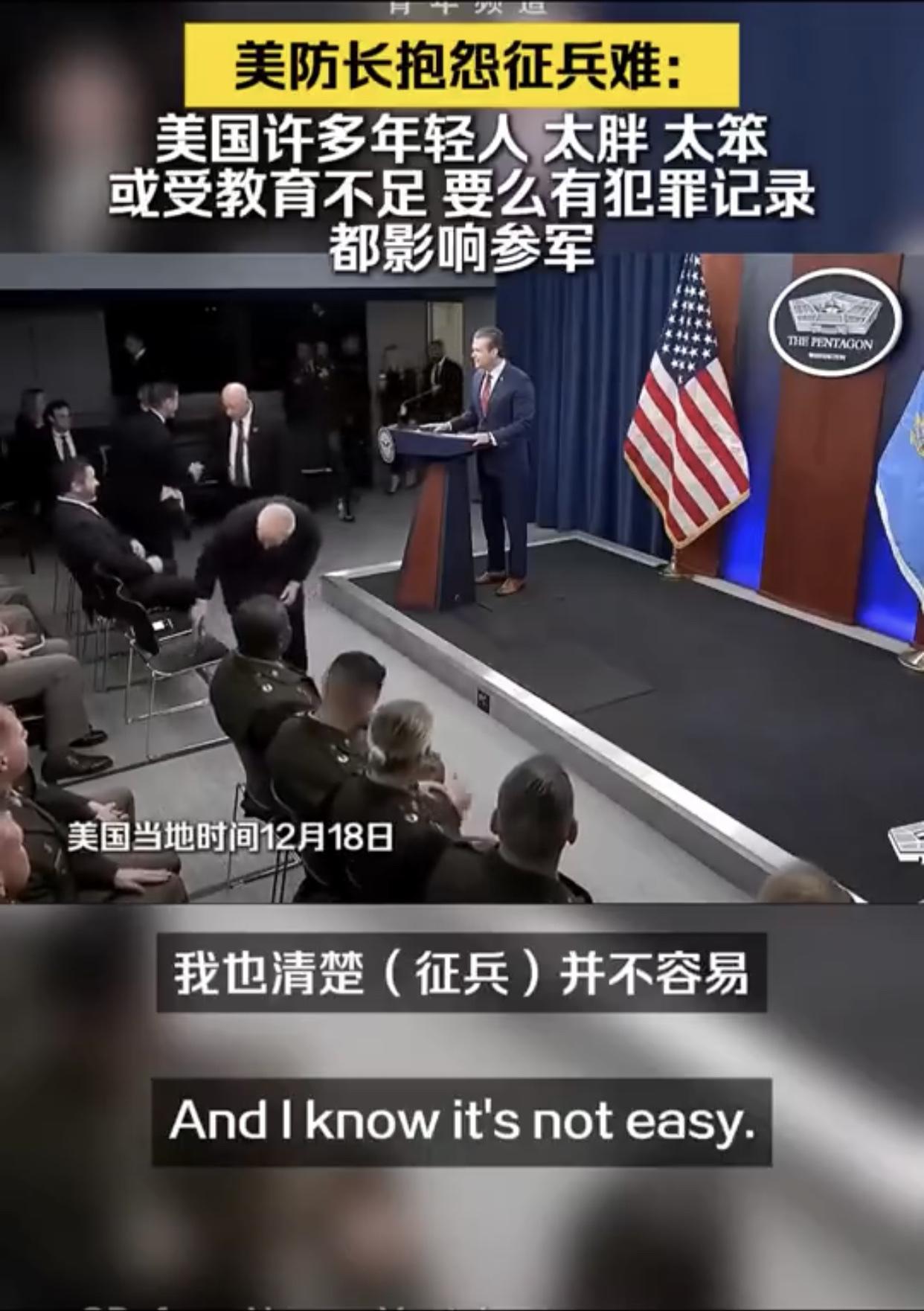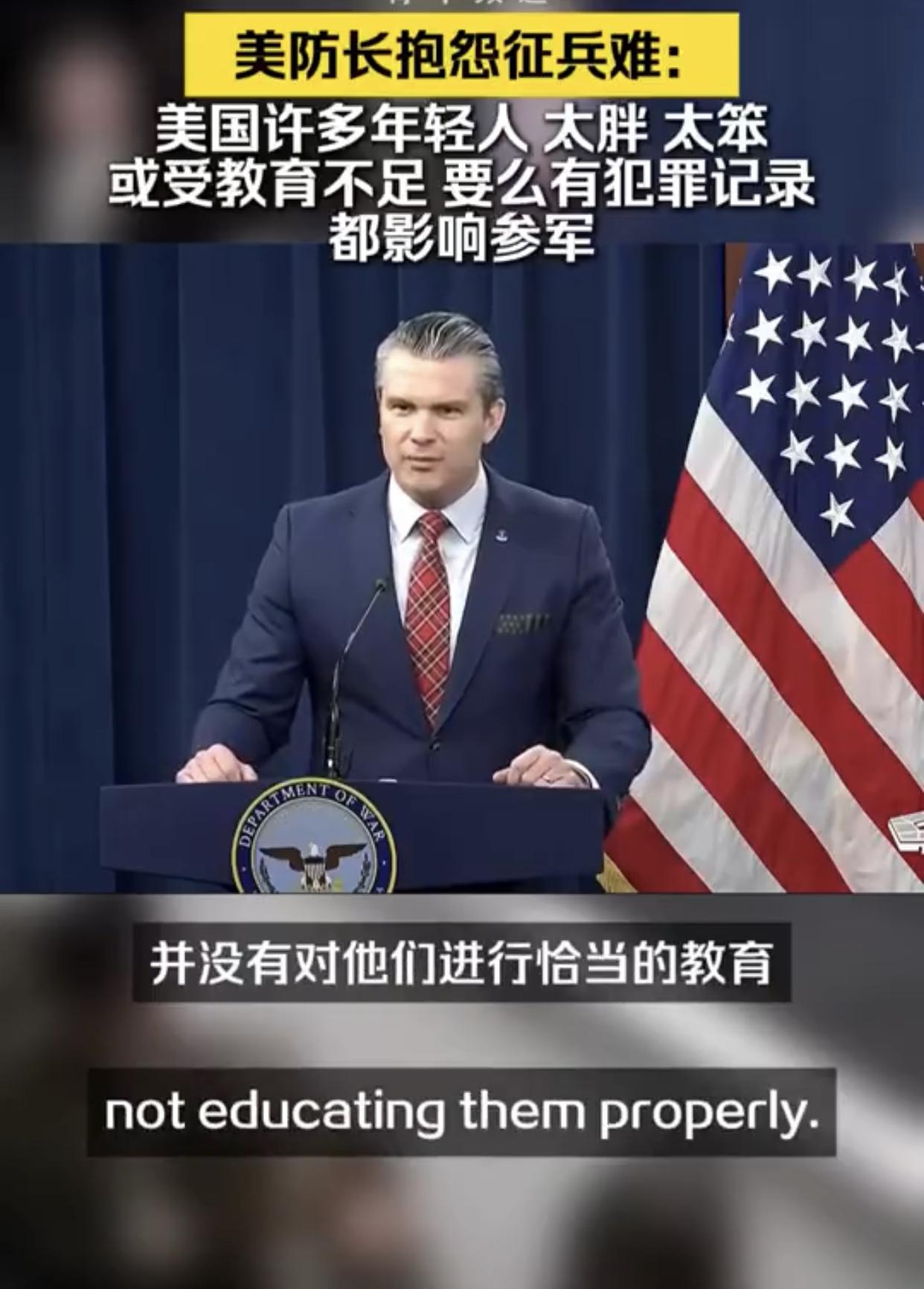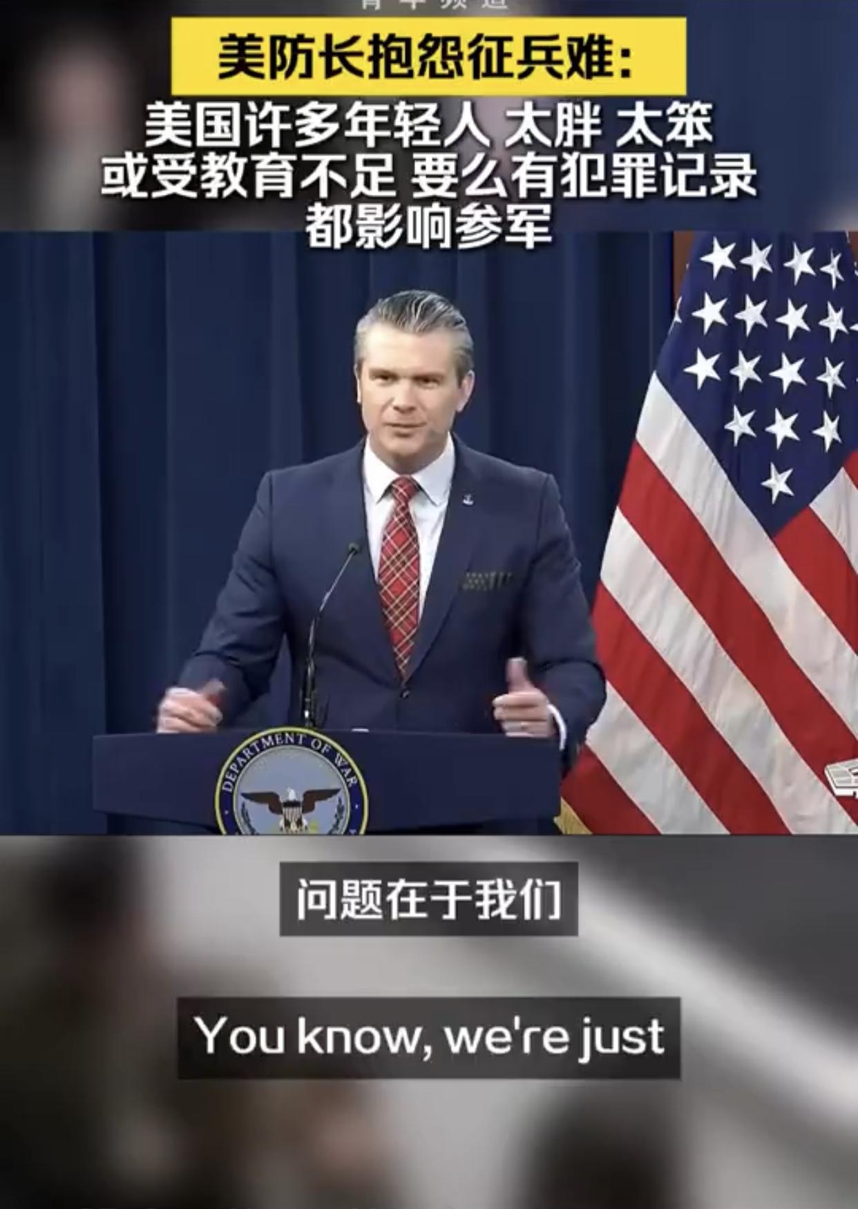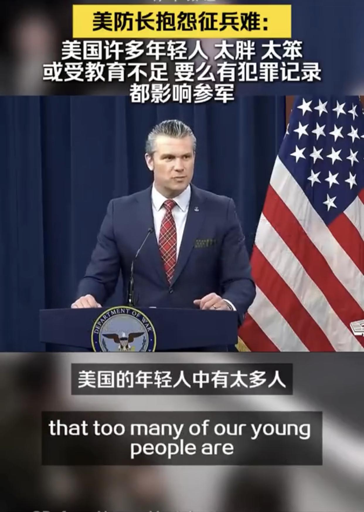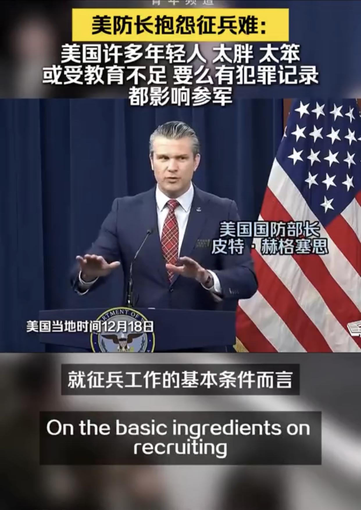 美国防长抱怨征兵难:“我知道就征兵工作的基本条件而言,征到合格的美国士兵并不容易,因为在美国的年轻人中,有太多人要么过于肥胖、要么过于蠢笨,说是蠢笨可能不太好,但是问题在于我们并没有对他们进行恰当的教育,他们或是有犯罪记录、或是患有注意力缺陷多动障碍或者其他各种情况,而所有这些因素共同影响着一个人是否具备参军的资格。”