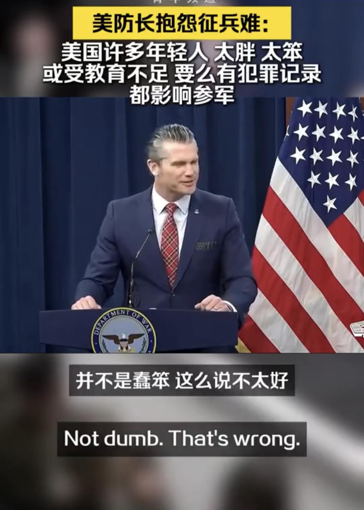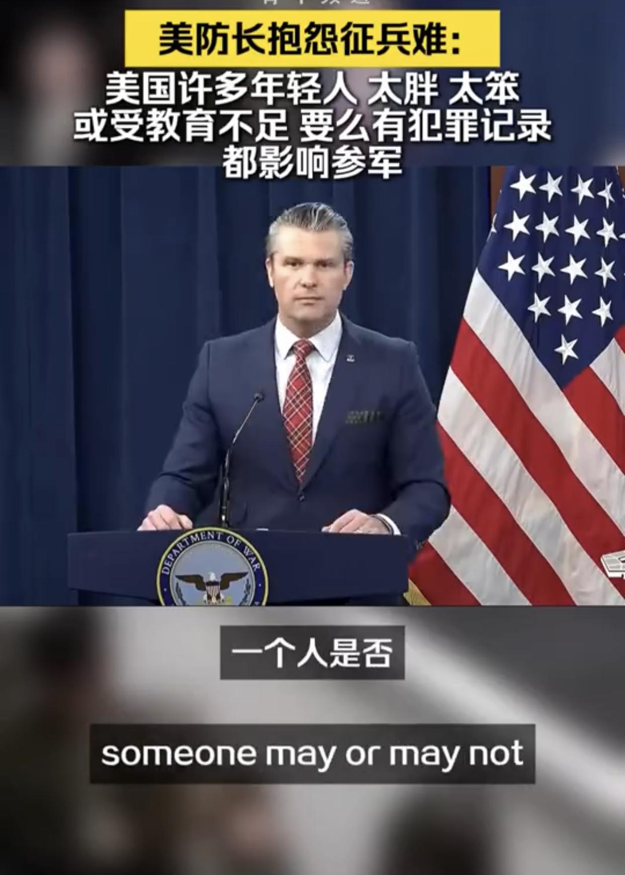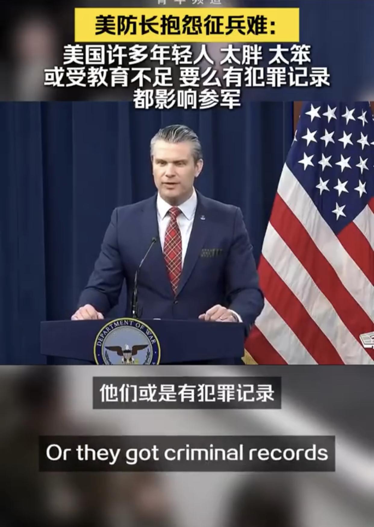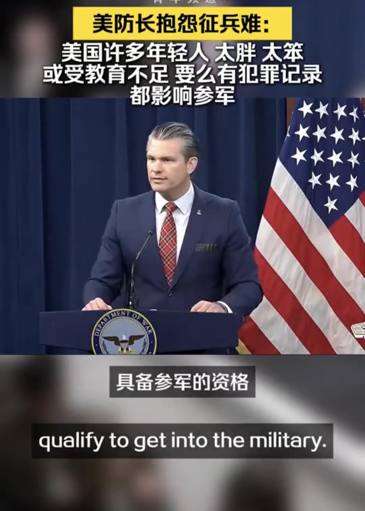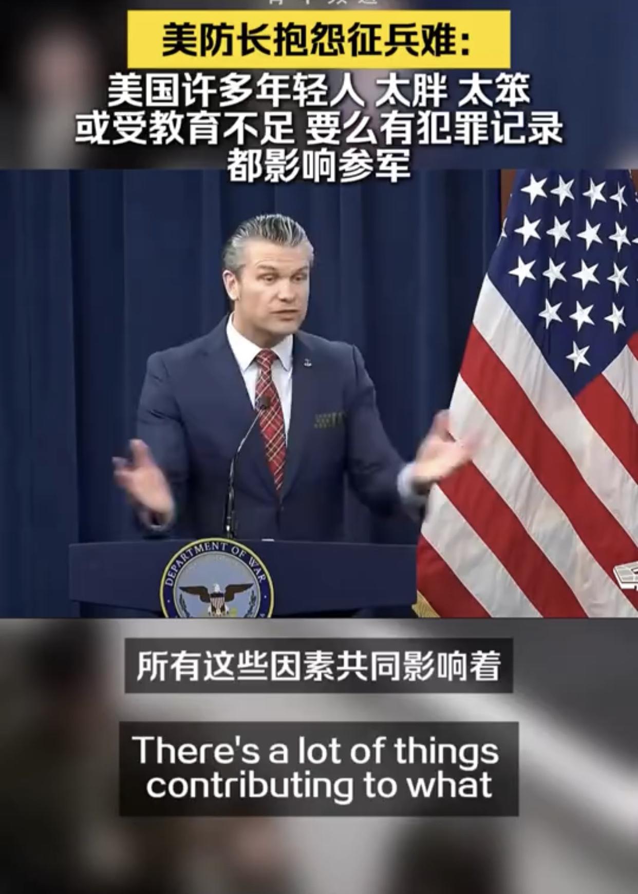 美国防长抱怨征兵难:“我知道就征兵工作的基本条件而言,征到合格的美国士兵并不容易,因为在美国的年轻人中,有太多人要么过于肥胖、要么过于蠢笨,说是蠢笨可能不太好,但是问题在于我们并没有对他们进行恰当的教育,他们或是有犯罪记录、或是患有注意力缺陷多动障碍或者其他各种情况,而所有这些因素共同影响着一个人是否具备参军的资格。”
