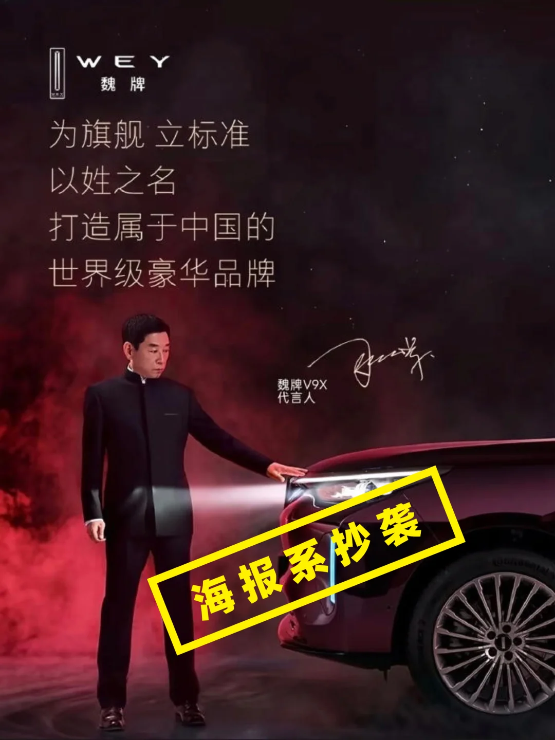 事件很清晰:魏牌官宣魏建军出任全新旗舰 V9X 代言人,并发布了一组宣传海报,很快被网友指出,这张海报在构图、人物姿态、场景与灯光上,几乎 1:1 复刻了路虎揽胜运动版的经典创意,相似度极高。
