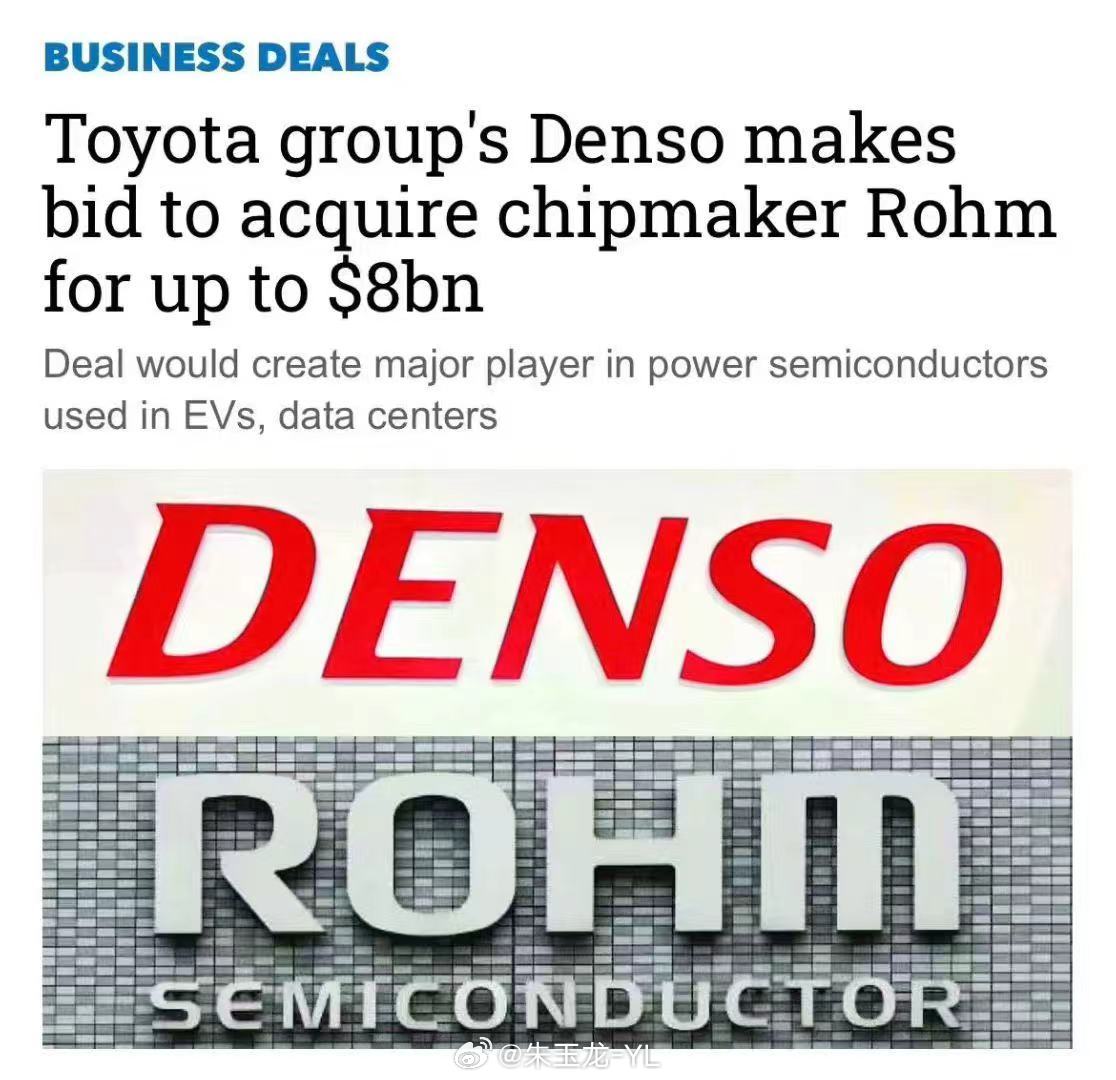 丰田集团旗下的汽车零部件供应商电装(Denso),已向半导体制造商 罗姆(Rohm)提出了收购要约,收购金额最高可达约 1.3 万亿日元,折合美元约 80-83 亿美元