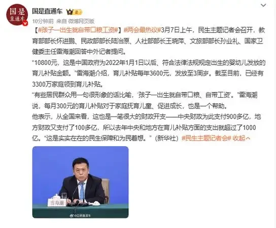 你敢信?现在的孩子真是“含着金汤匙”出生!最近,国家卫健委主任雷海潮在记者会上的一句话,直接把网友给整羡慕了:“孩子一出生就自带口粮、自带工资”。这可不是什么网络段子,而是真金白银的国家福利!这背后到底藏着什么“搞钱”新路子?咱们今天就来好好扒一扒。