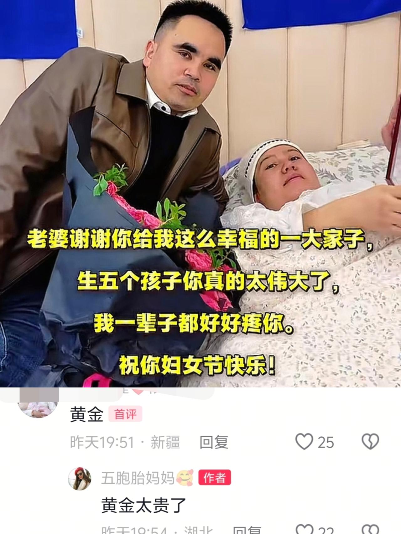 五胞胎爸爸今天考虑了一天,也没舍得买黄金,而是买了一束花和照片,有网友建议他买黄金,她的老婆回复:“黄金太贵了!” 今天是三八妇女节,五胞胎爸爸昨天就发视频问网友送老婆什么礼物好? 有网友打趣说:“送黄金。”五胞胎妈妈回复:“黄金太贵了!” 还记得妈妈刚生完五胞胎的时候,孩子爸爸就说回家要给老婆买黄金,估计现在也是感受到压力大了,能省则省了,毕竟现在黄金也特别贵,还有5个孩子要养呢! 最后爸爸挑了束粉色的花,还送了张五个宝宝在一起的合照,五胞胎妈妈也很喜欢,因为她到现在还没见过孩子,看见这张照片就感觉孩子在自己身边一样! 虽然没送黄金,但挑的礼物也很用心,现在有了五个孩子,不能光把钱花在浪漫上,还得眼光长远点,精打细算更实在! 视频里看到妈妈的气色恢复的还不错,床边也有家人在照顾着,爸爸也学会了拍视频记录生活,还经常开播,已经10万粉丝了,如果能吃上互联网这碗饭,以后五个宝宝是不愁养了! 即使压力很大,当初爸爸依然坚定选择不减胎,连李家福医生都发现他的经济还是困难的,每次产检做B超1000多块钱,还是有点面露难色的。 现在孩子还没出院,等出院了,这个经济跟精力就像无底洞,永恒发动机一刻不能停啊! 五胞胎妈妈是幸运的,也是勇敢的,祝福五个宝宝健康成长!