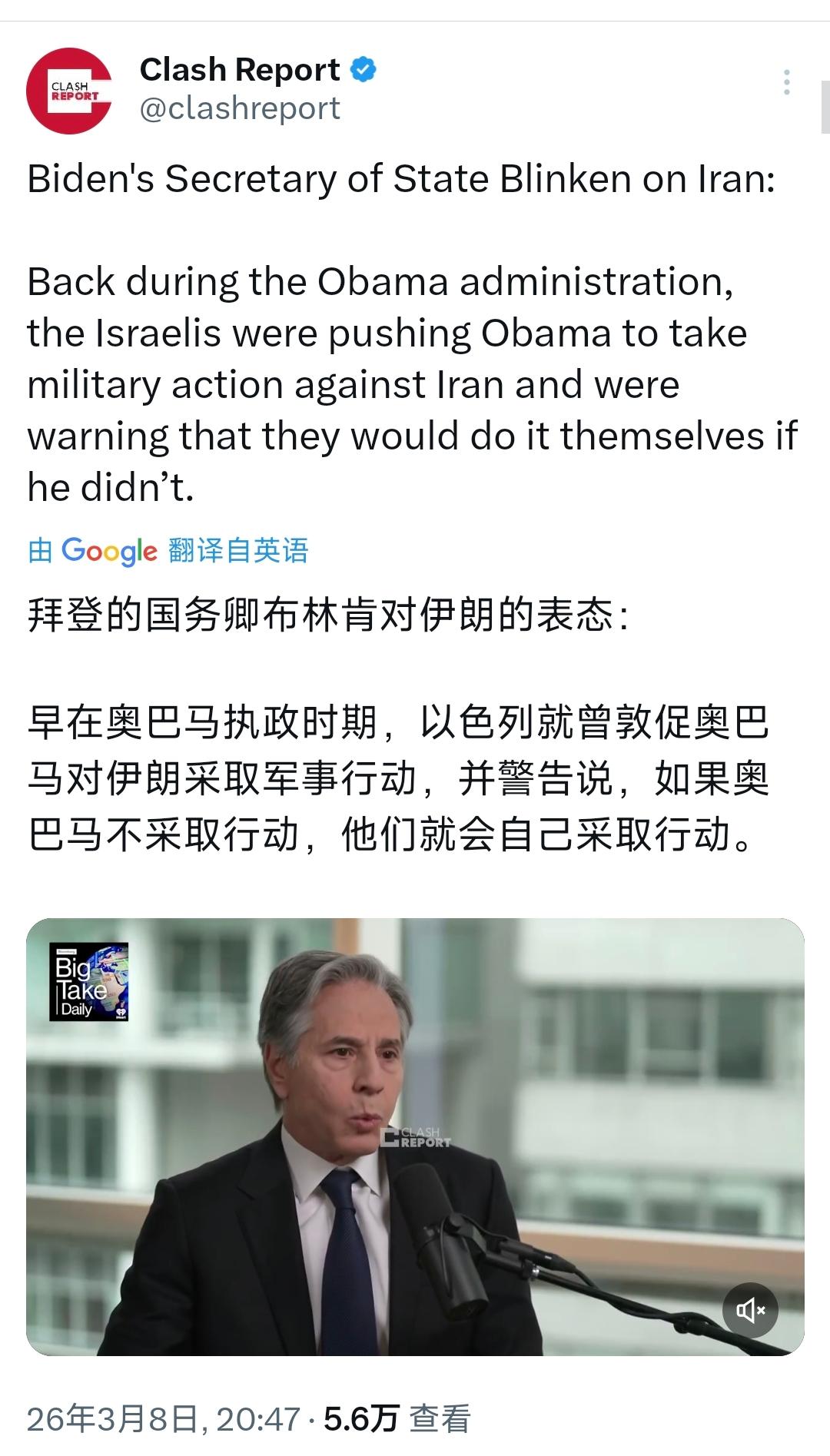 美国前国务卿布林肯今天(北京时间3月8日)接受采访时表示:“”早在奥巴马执政时期,以色列就曾敦促奥巴马对伊朗采取军事行动,并警告说,如果奥巴马不采取行动,他们就会自己采取行动。” [机智]评几句:布林肯这是在暗示奥巴马和拜登都顶住了以色列的压力,而特朗普没有。实际上,美国两党对以色列长期的纵容和偏袒导致其在中东愈发肆无忌惮,所谓的“顶住压力”不过是表象,实则是不同执政风格下的利益权衡。奥巴马虽未直接对伊动武,却也从未真正约束以色列的扩张行径,拜登政府更是一边口头施压一边持续输送军援,两党从未跳出对以色列纵容的框架。布林肯刻意制造总统间的差异,不过是故意在“黑”特朗普。