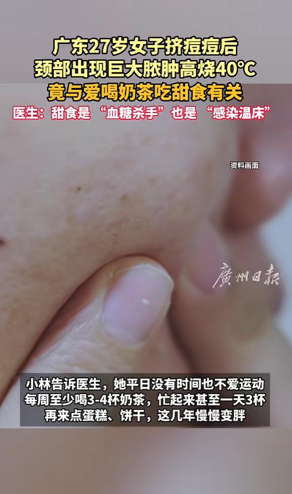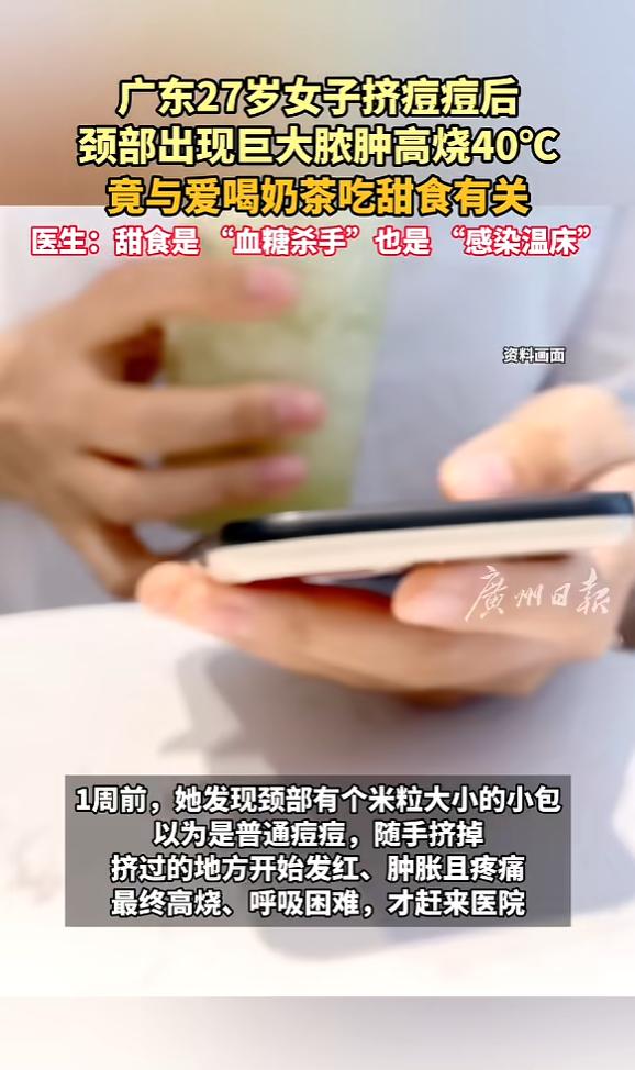 “悲剧还是发生了!”近日,广东深圳,一女子不爱运动,喜欢喝奶茶吃零食,这几年开始慢慢变胖,最近,她发现颈部有个小包,以为是痘痘,可挤掉后竟开始发红肿胀,最终高烧呼吸困难,去医院被确诊为严重皮肤软组织感染合并糖尿病!   事情发生在春节前夕,当时深圳龙华区人民医院急诊科来了一位27岁的年轻女子,她独自一人,脚步沉重,颈部疼得厉害,全身滚烫,连呼吸都觉得费力。   医生一量体温,已经烧到了40摄氏度。   而之后的检查结果让所有人都捏了把汗,她的随机血糖接近20mmol/L,远超正常范围;白细胞计数高达两万,炎症指标超标几十倍。   甚至颈部彩超显示皮下形成了巨大脓肿,医生诊断这是严重的皮肤软组织感染,合并2型糖尿病,如果不及时处理,可能引发败血症甚至感染性休克。   最终在医生的询问下才知道,原来这名女子在毕业后一直在深圳打拼,上班时间长,没功夫锻炼身体。   同时她还特别喜欢喝奶茶、吃零食,每周至少要喝三四杯奶茶,忙起来的时候一天就能灌三杯,再搭配些蛋糕、饼干,这几年下来,身材慢慢变胖,体重一路上升。   直到一段时间后,她总觉得口干舌燥,喝再多水也不解渴,上厕所的次数也明显增多,但她没当回事,觉得只是平时喝水少、熬夜多导致的,没放在心上。   一周前,她发现自己颈部冒出一个米粒大小的小包,看着和普通痘痘没区别,就随手用手挤掉了。   她没想着洗手消毒,也没意识到这个小动作会带来大麻烦。   挤掉之后没多久,挤过的地方就开始发红、肿胀,还伴随着明显的灼热感和疼痛。   她想着可能是挤发炎了,就去社康开了点外用药膏涂抹,可症状不仅没好转,反而越来越严重。   没过几天,她开始发高烧,体温一路飙到40℃,整个人晕乎乎的,浑身无力,连呼吸都觉得费力,站都站不稳,直到这时,她才慌了神,赶紧独自前往龙华区人民医院急诊科就诊。   于是出现了开头的一幕,在医生接诊后,当天就安排了脓肿切开引流术,术中引流出大量黄白色脓液,还夹杂着腐肉样的坏死组织,后续每天排出的脓液都超过50毫升。   其实这事说起来,都是不良生活习惯埋下的隐患,毕竟长期大量喝奶茶、吃甜食,会加重胰岛的负担,慢慢引发胰岛素抵抗,最终形成糖尿病。   而高血糖环境会抑制免疫细胞的杀菌能力,让细菌更容易繁殖,为感染埋下伏笔。   更重要的是挤痘痘这个小动作,刚好给了细菌可乘之机。   要知道我们手上的细菌本来就多,没消毒就挤痘痘,不仅会破坏皮肤屏障,还会把皮肤表面的细菌推向更深的皮下组织。   加上她本身血糖高、免疫力下降,细菌在皮下快速繁殖,短短几天就发展成了巨大脓肿,还引发了高烧、呼吸困难的危重情况。   现在很多年轻人都和她一样,把奶茶当水喝,零食不离手,不爱运动,觉得年轻就可以肆意消耗身体,忽略了身体发出的信号。   总觉得小痘痘、口干这些都是小事,熬一熬就过去了,却不知道这些小事,很可能会拖成重症。   要知道糖尿病从来不是中老年人的专属,现在越来越多的年轻人因为不良饮食和生活习惯患上糖尿病。   而皮肤的微小破损,在高血糖环境下,也可能引发致命感染。   希望这件事能给大家提个醒,少喝一杯奶茶,就是给胰岛减一份负担;管住手不挤痘痘,就是给皮肤多一层保护;多花点时间运动,就是给免疫力加一份底气。   别等小问题拖成大麻烦,才后悔当初没有重视。   对此您有什么不同的看法,可以在评论区留言讨论!!!   信息来源:《广东27岁女子挤痘痘后颈部出现巨大脓肿高烧40°C,竟与爱喝奶茶吃甜食有关》广州日报