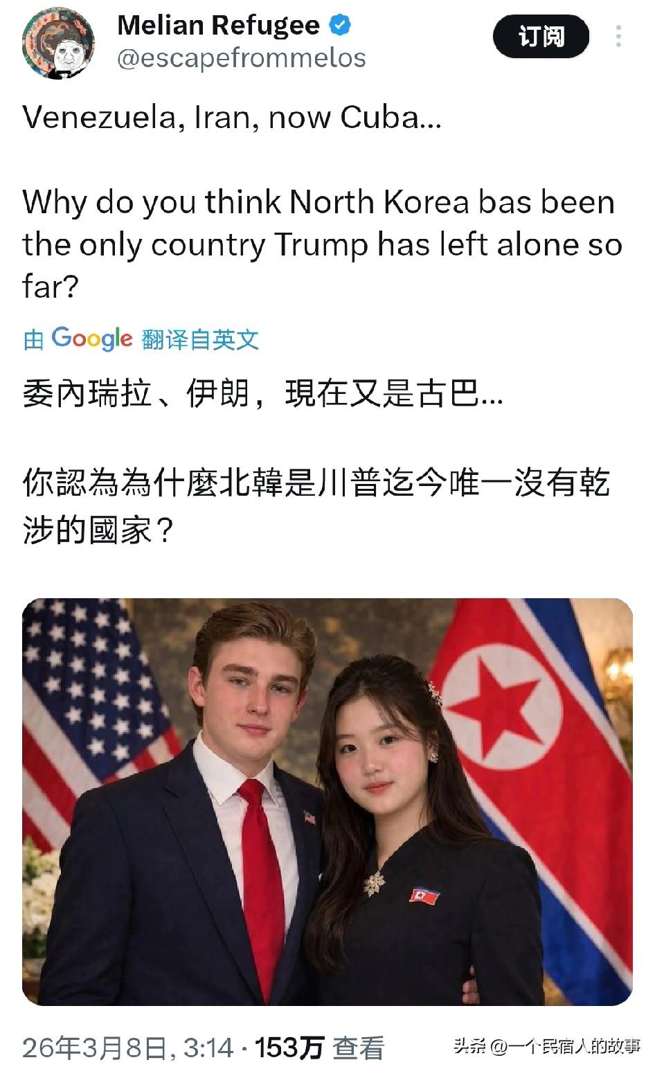 外网热议:川普打委内瑞拉、伊朗!为啥不打朝鲜? 霉利坚帝国总统唐纳德.特朗普上台一年以来,已经先后对全世界八个国家开战,尤其是对委内瑞拉直接抓人家总统,对伊朗几乎全面开战!但唯独没有对真正的刺头朝鲜开战!为什么呢? 这个疑问成了最近外网最热的话题!甚至引发了不少网友恶搞!
