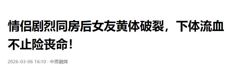 “悲剧还是发生了”。广东深圳,男子早上与女友亲热,由于同房动作较为剧烈导致女友下体出血。紧张之下,男子火速陪同女友来到医院检查,结果是囊肿破裂,内出血情况非常严重。 2026年3月8日清晨,深圳南山区一间出租屋内,26岁的小李突然瘫倒在床边。 她脸色煞白,腹部传来钻心的剧痛,甚至无法发出完整的呼救声。就在几个小时前,她刚经历了激烈的亲密行为。由于动作幅度过大,她体内的生理组织在猛烈撞击下瞬间破裂。 被送到医院抢救时,小李神志模糊,生命垂危。医生紧急切开腹腔,眼前的景象令人心惊:暗红色的积血已经溢满了整个盆腔,出血量高达1200毫升。 这个数字意味着小李失去了全身接近四分之一的血液,心脏随时可能停跳。万幸的是,房东及时报警,医院迅速开启绿色通道,才把她从死神手里抢了回来。 这显然是医学常识匮乏带来的后果。对于育龄女性来说,排卵后的两周内,卵巢会形成一个壁很薄、血管却异常丰富的组织,叫做黄体。 这个阶段的身体非常脆弱,无法承受猛烈的腹部冲撞。无论是剧烈运动,还是过度用力的生活琐事,都可能导致这层薄薄的组织发生破裂。 在妇科急诊室里,黄体破裂并不罕见。尴尬的是,很多女性因为羞耻感,在面对医生询问时会隐瞒真相,这往往让医生在初期诊断时走弯路,甚至导致病情恶化。 而诊室外沉默自责的男方,也从侧面反映出大众对生理周期风险的认知缺失。在追求感官体验之前,了解基本的身体律动,比什么都重要。 这件事在法律层面同样有明确的界定。虽然双方是自愿互动,男方也没有主观伤人的意图,但这并不代表可以免除所有责任。 健康权属于公民的基本权利,男方在互动过程中忽略了对女方的保护义务,造成了实质性的人身伤害,在法律上理应分担医疗费和误工费等经济损失。 激情过后的责任判定听起来有些冷酷,但它是在提醒每一位成年人,亲密关系的基础是尊重和呵护,而不是对另一方身体极限的透支。 法律的存在是为了平衡伤害,更是为了让每个人学会对自己的行为负责。 想要规避这种风险,除了在特殊时期保持克制,定期的妇科彩超检查也必不可少,这能帮女性提前排查潜在的囊肿隐患。 我们习惯于关注情感的浓淡,却常忽略身体发出的预警。掌握基础的生理常识不仅是为了自救,更是为了避免让表达爱意的时刻,变成无法挽回的生理和心理创伤。 生命经不起无知的碰撞。真正的爱需要建立在科学认知的基础上。当你在意对方感受时,请务必留意她那需要精心保护的生理构造。对身体常识多一分敬畏,这段感情才能多一分安全保障。 信息来源:《情侣剧烈同房后女友黄体破裂,下体流血不止险丧命!》,中原融媒,2026年3月6日。