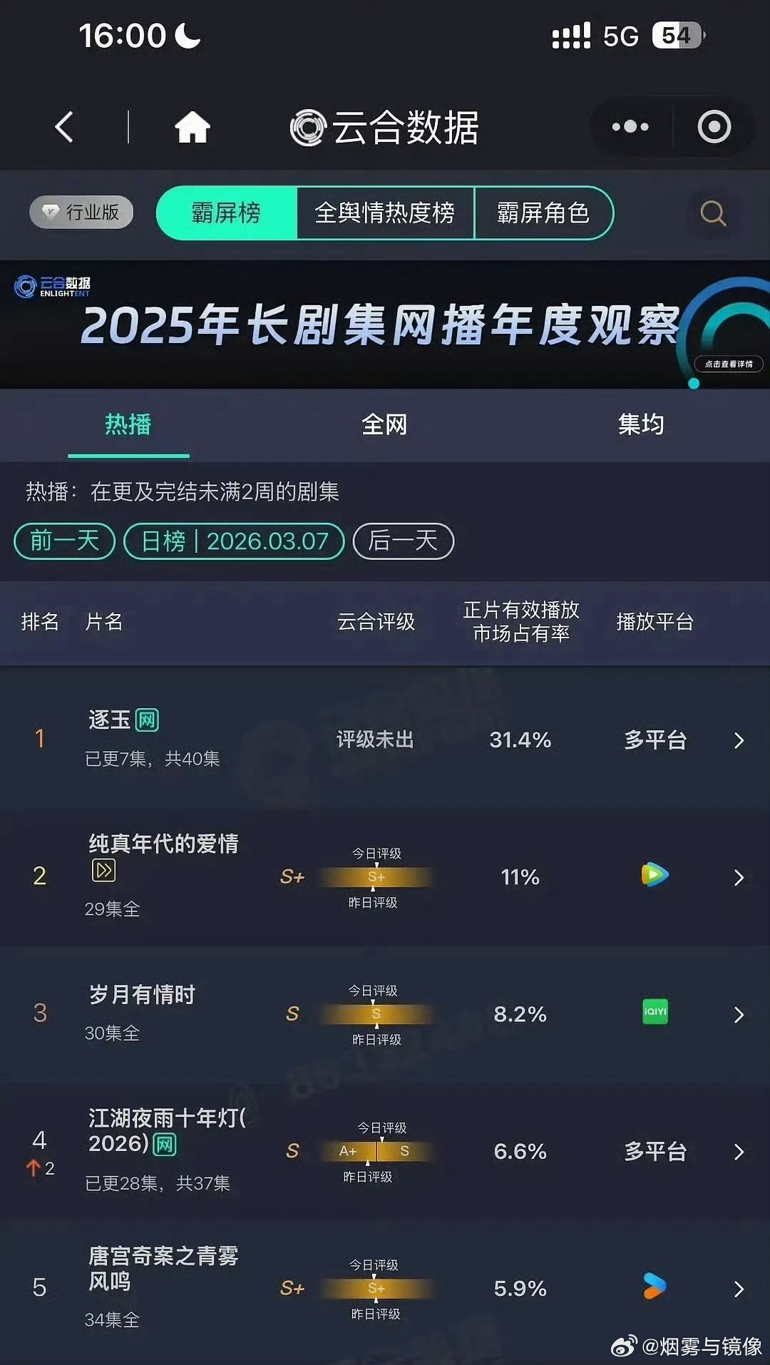 逐玉播放量超过狂飙《逐玉》第二天的播放量已经超过了狂飙这么厉害