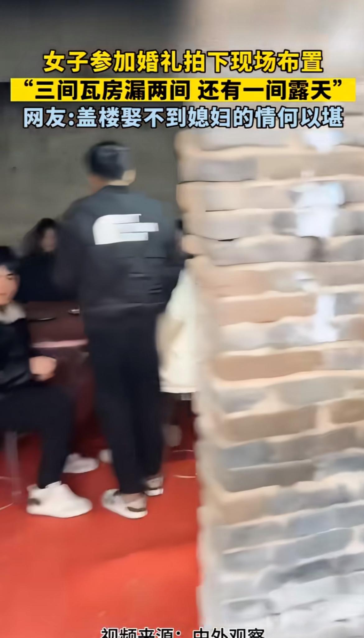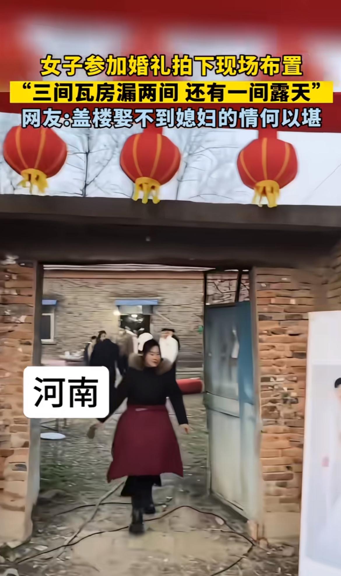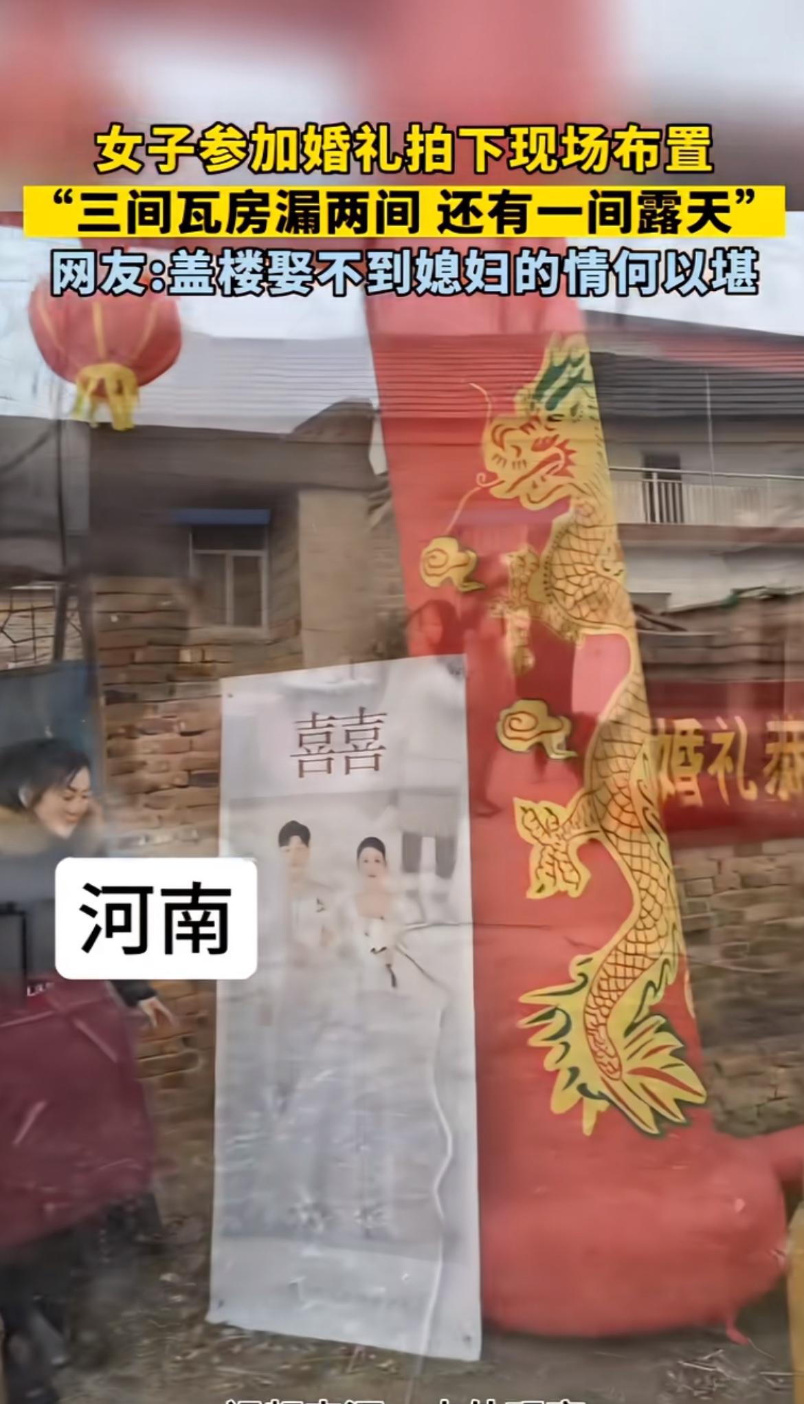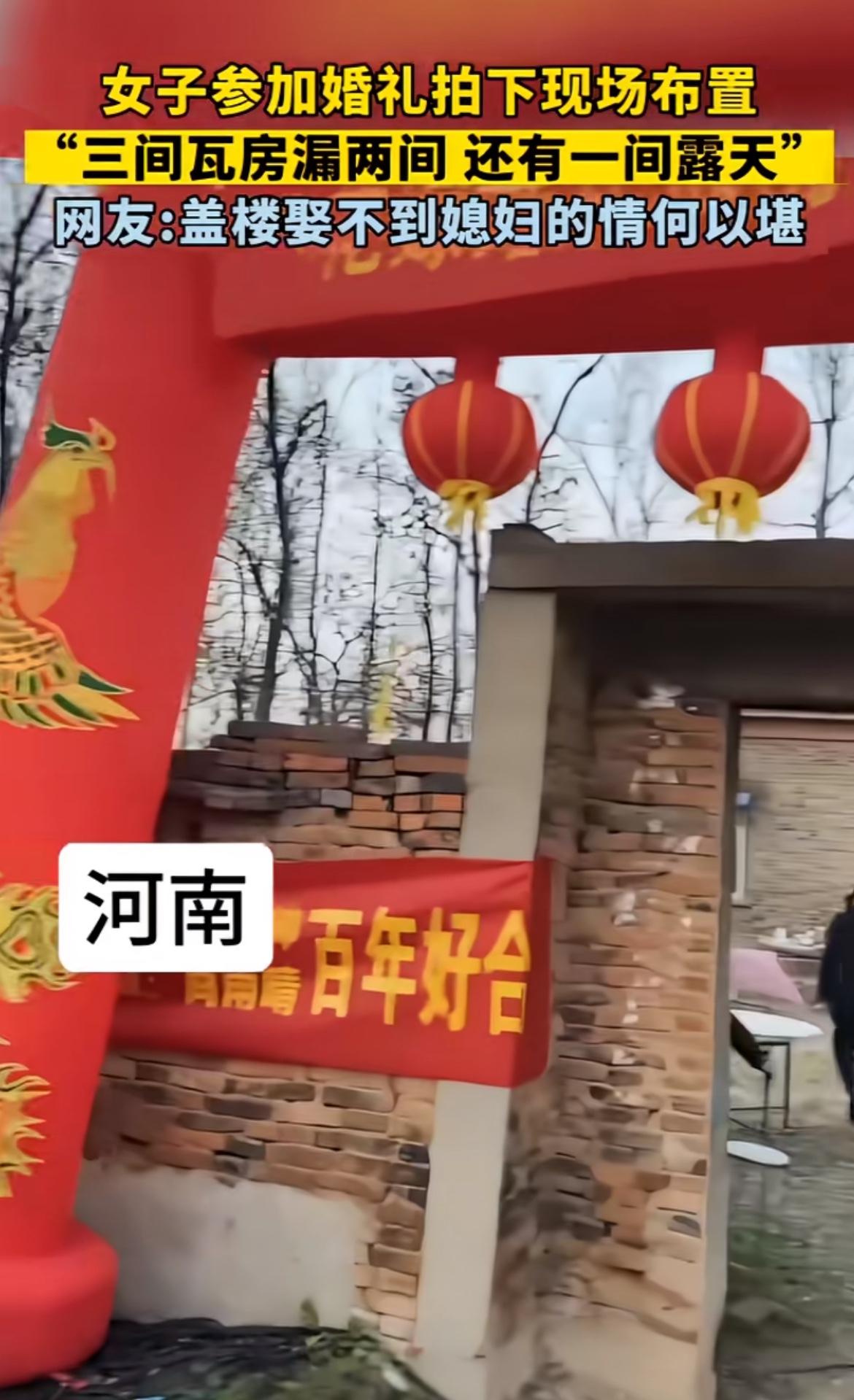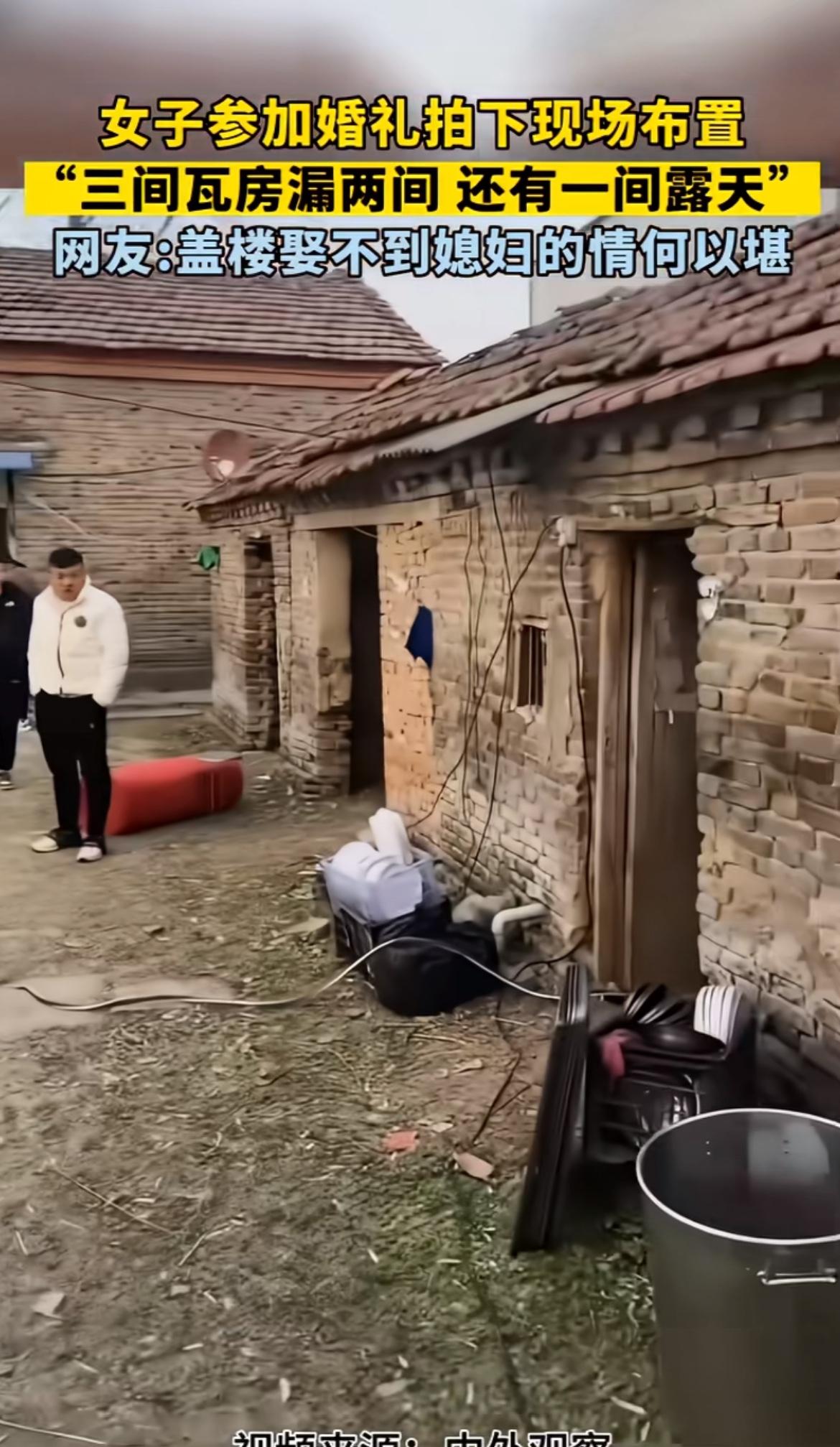 看到这农村婚礼现场,三间瓦房漏两间,还有一间露天,心里真不是滋味。以前农村条件差,很多婚礼都在这样简陋的环境里办。我想起老家有对新人结婚,也是在破旧的房子前摆酒席。没有豪华的礼堂,没有绚丽的灯光,就几张旧桌子拼凑起来。但大家脸上都洋溢着幸福的笑容,亲朋好友围坐一起,热闹非凡。虽然物质条件匮乏,可这份质朴的情感才是最珍贵的。现在农村发展好了,很多人婚礼也越来越像样,但那种纯粹的感觉,却很难再找回了。