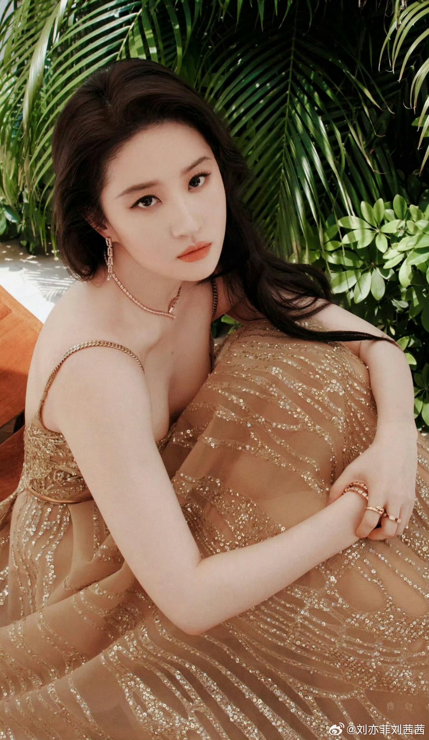 配饰方面,全套玫瑰金珠宝与礼服金色元素相呼应,细节精致尽显高级质感。场景切换于热带绿植环绕的户外露台与简约现代的室内空间,无论是倚坐木质长椅还是斜靠浅灰沙发,她都美得如画中人。