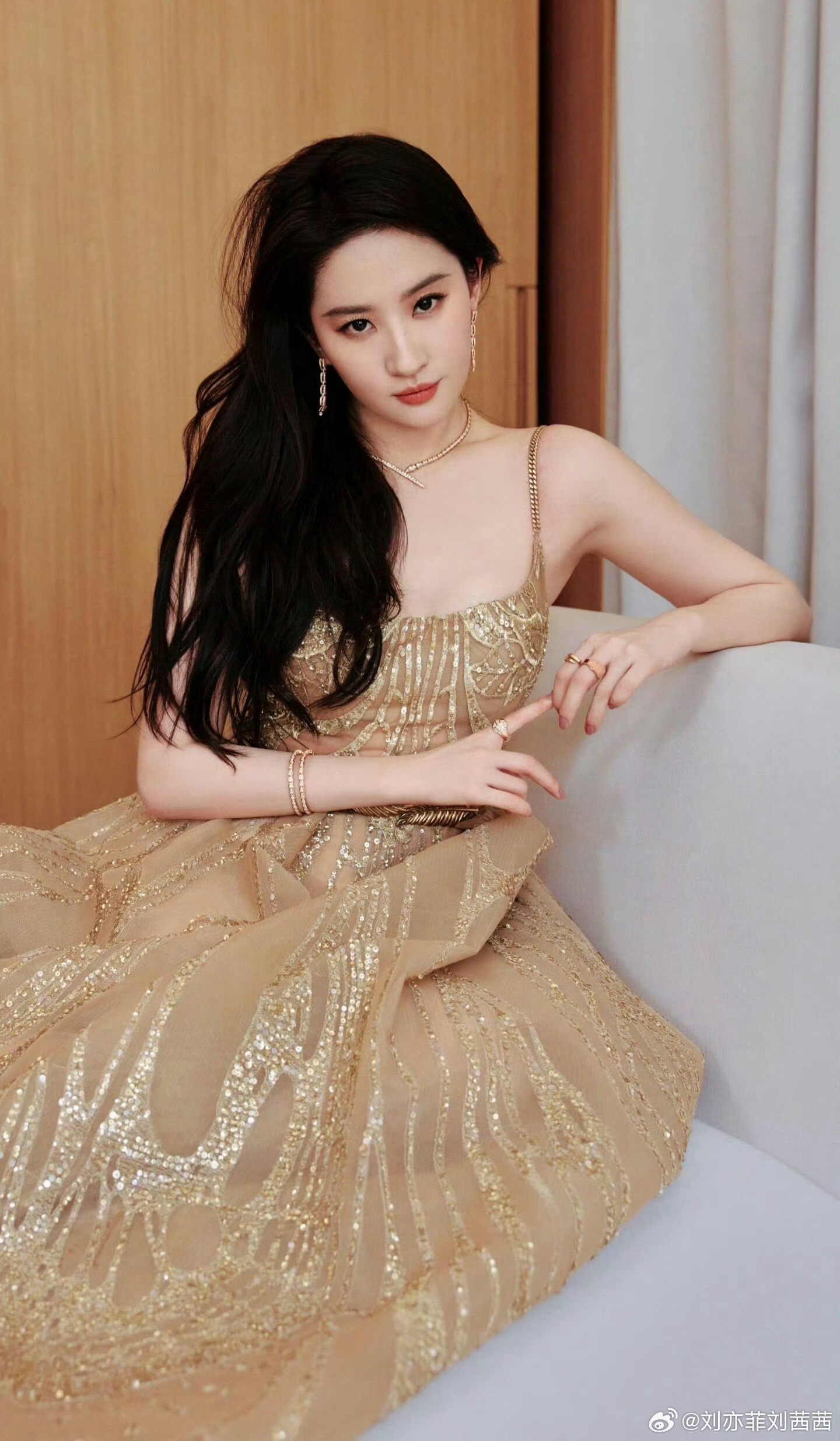刘亦菲身着一袭香槟金鎏金吊带礼服,细腻薄纱基底上缀满金色亮片与刺绣线条,在光线下璀璨夺目。