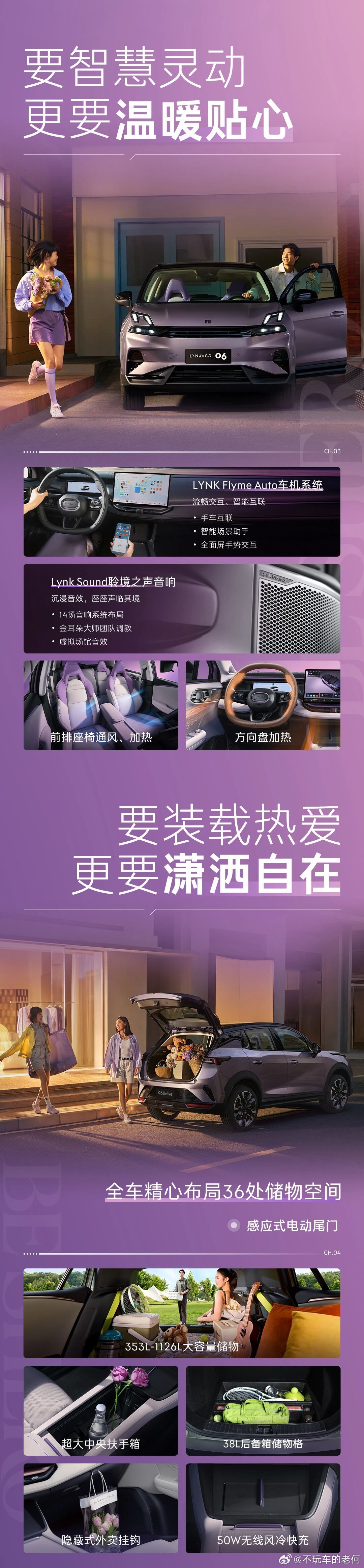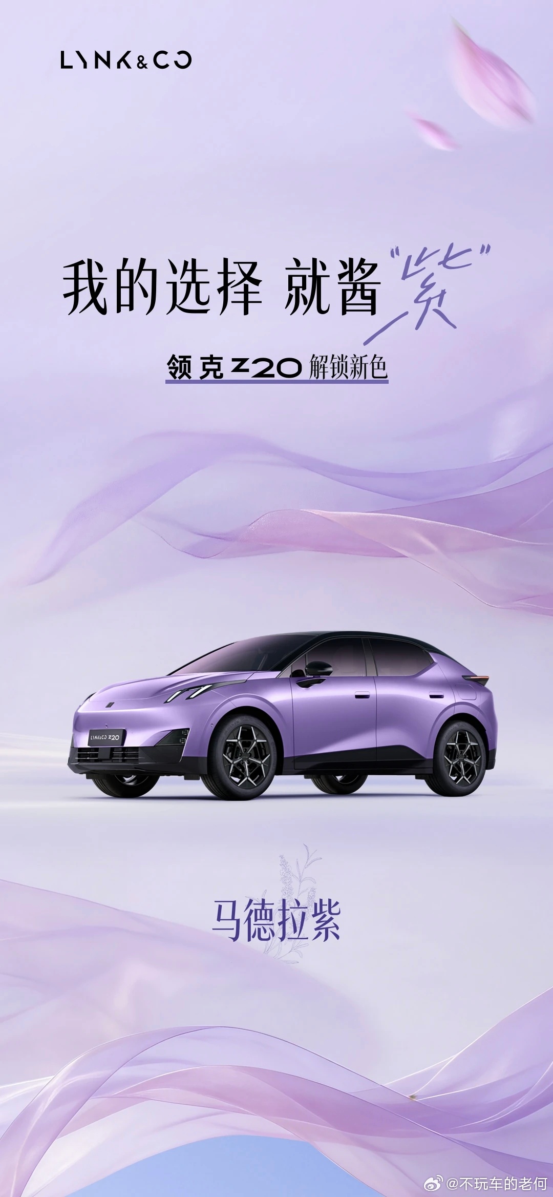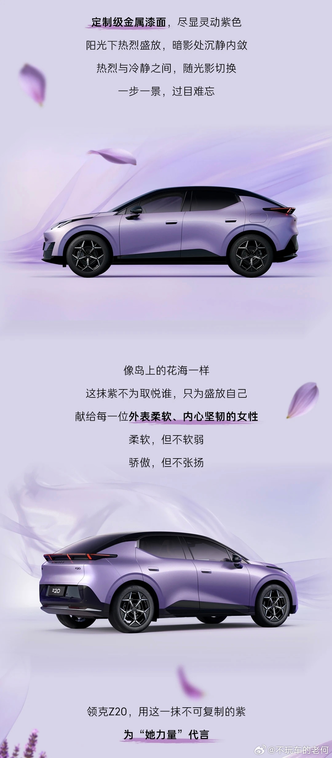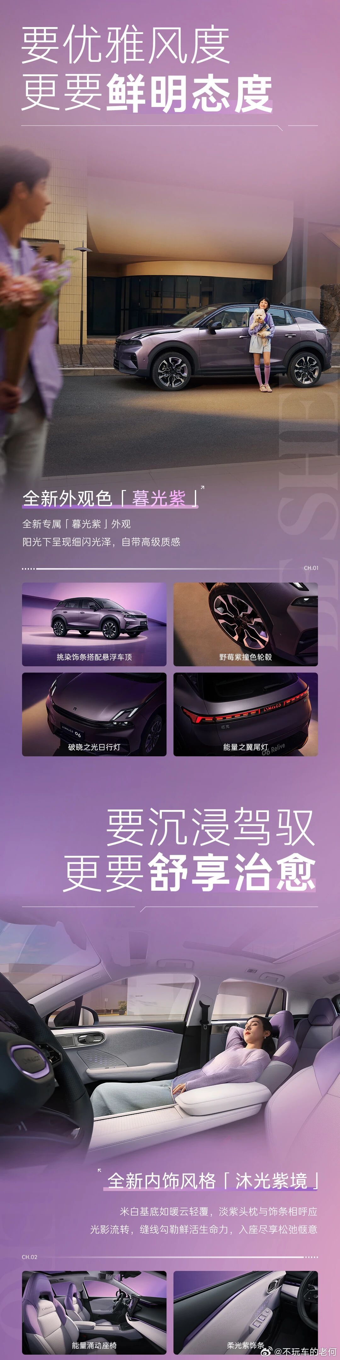 06在2025年曾经推出过极光紫的特别版,限量166台很快就被秒空,这次领克06 Relive又推出了“暮光紫”配色,依然是特别的交车礼盒,11.16万起的最终售价,还送了14扬声器的哈曼卡顿音响,也有终身质保。另外女车主占比较高的领克z20 也推出了马德拉紫的版本,看来这两年紫色是挺流行的颜色了。领克汽场全开