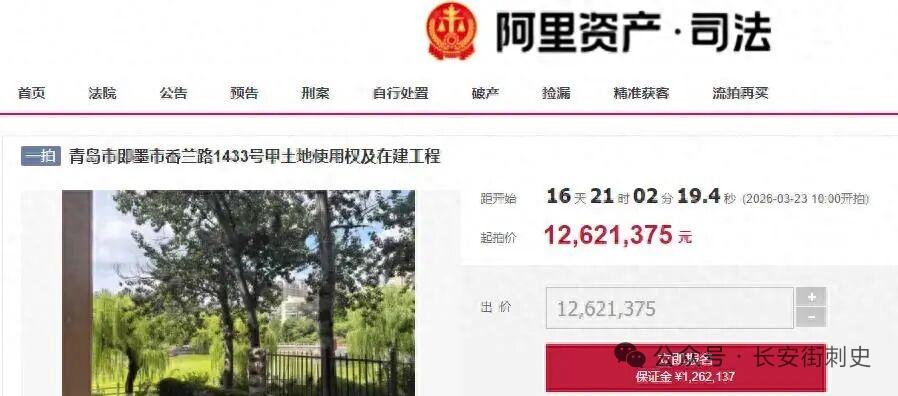 天南地北大拜年近日,即墨区蓝鳌路1433号甲土地使用权及在建工程(龙海商务大厦项目)启动司法拍卖程序,起拍价为12621375元,3月23日10时起拍,目前无竞买人报名参与。蓝鳌路1433号甲土地使用权及在建工程土地使用权人为青岛欧美房地产开发有限公司,地块用途为商务办公,使用权面积为2371平方米,终止日期为2050年9月19日。