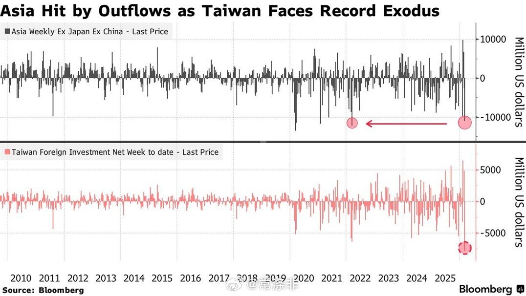 上周, 全球投资者抛售了除中国以外的亚洲发展中国家价值 110 亿美元的股票, 这是自 2022 年3月以来最大的单周资金流出。