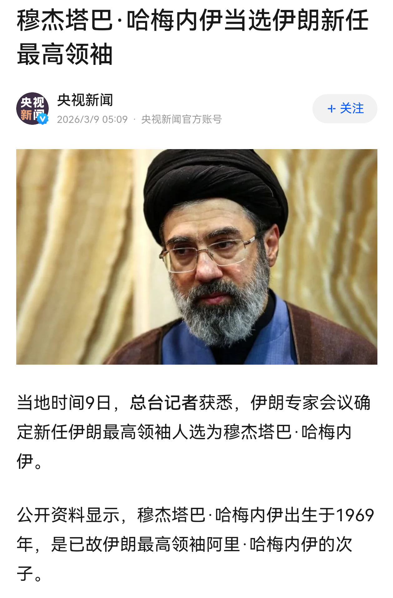 “接过父辈手中的旗帜”,还是“哈梅内伊”美伊以冲突哈梅内伊之子当选伊朗新任最高领