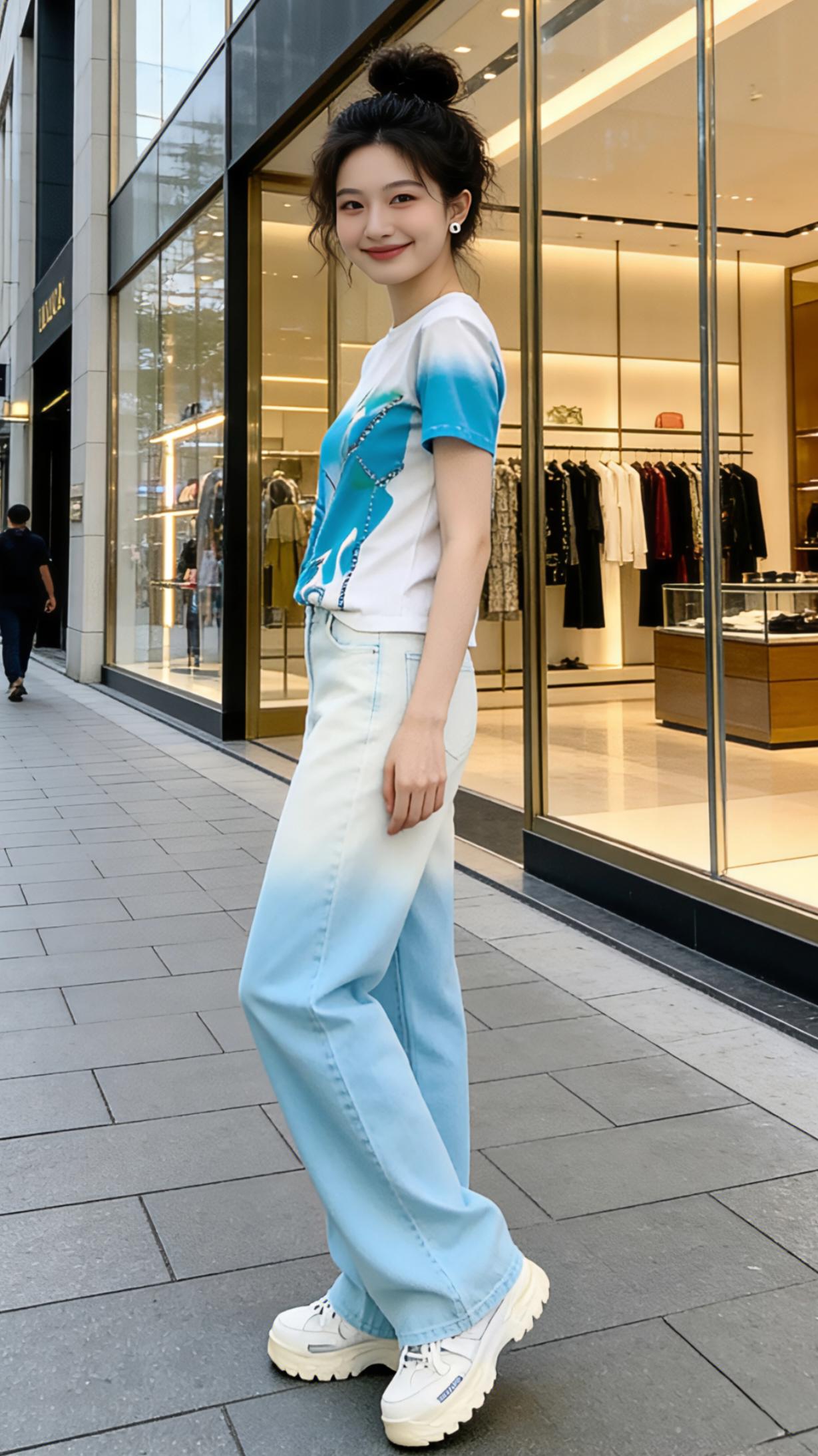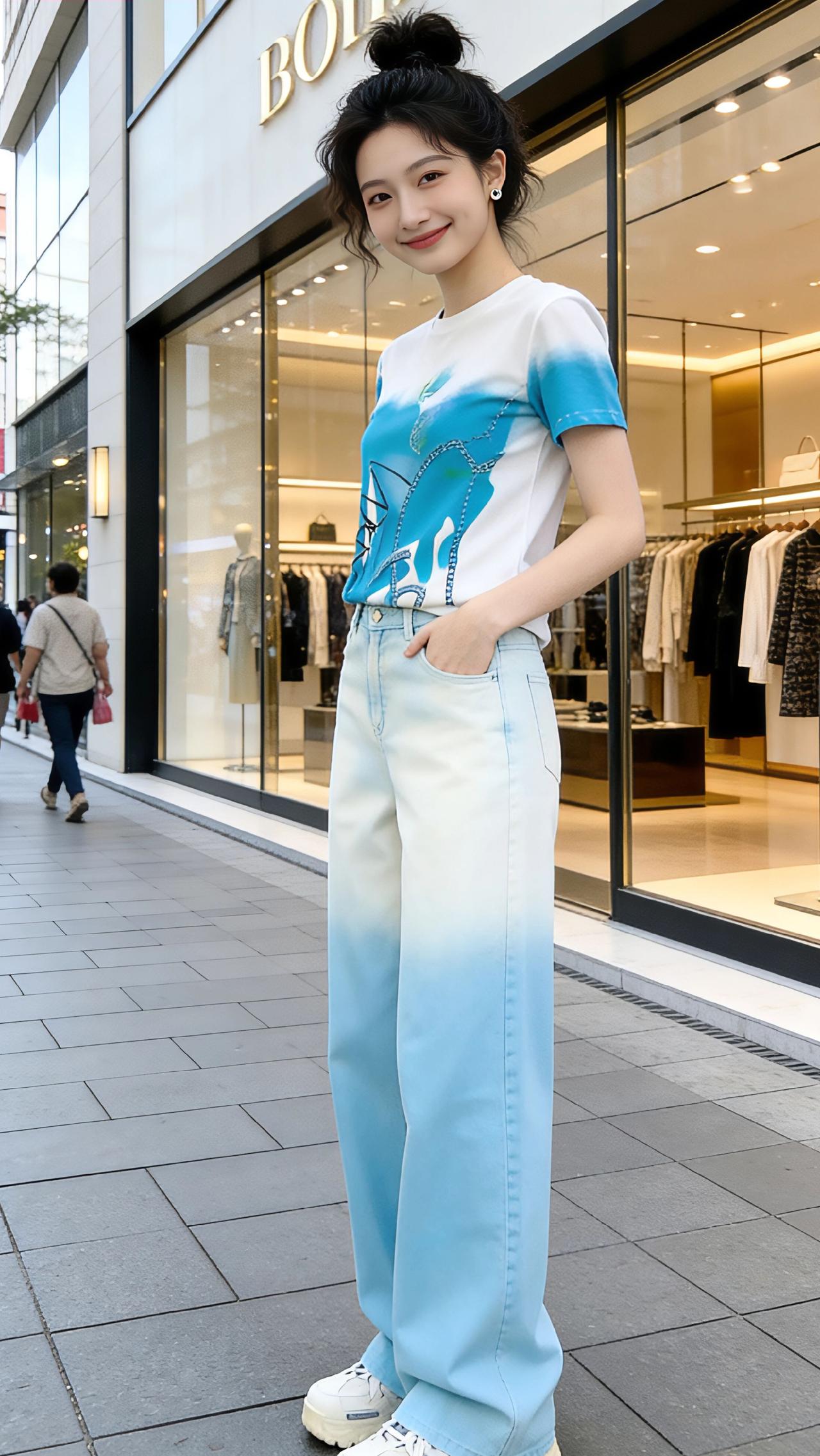 蓝调都市漫步 风掠过步行街的灰色地砖,带着橱窗里衣料的轻软气息,拂过她高扎的丸子头。渐变蓝的T恤像把天空揉碎了穿在身上,从白到浅蓝再到清透的湖蓝,和渐变色牛仔裤连成一片流动的蓝调,在都市的喧嚣里晕开一抹清爽。 她站在高级服装店的落地窗前,玻璃映出店内暖黄的灯光和错落的衣饰,也映出她眼底的笑意。耳上的银饰在光里闪着细碎的光,像藏在发间的星子。有时她会将手插进裤袋,姿态松弛又利落;有时侧身迈步,宽大的裤脚扫过地面,带着随性的飒爽。 行人步履匆匆擦肩而过,她却像自成一方天地。这身蓝白渐变的穿搭,是都市里的一抹呼吸感——不刻意张扬,却在不经意间,把夏日的清爽和都市的精致,都揉进了每一步里。风又起时,她抬眼望向街角,蓝调的衣摆轻轻晃动,像在与这座城市,共赴一场温柔的漫步。 早春穿搭 时尚女装 春夏穿搭 新款上新