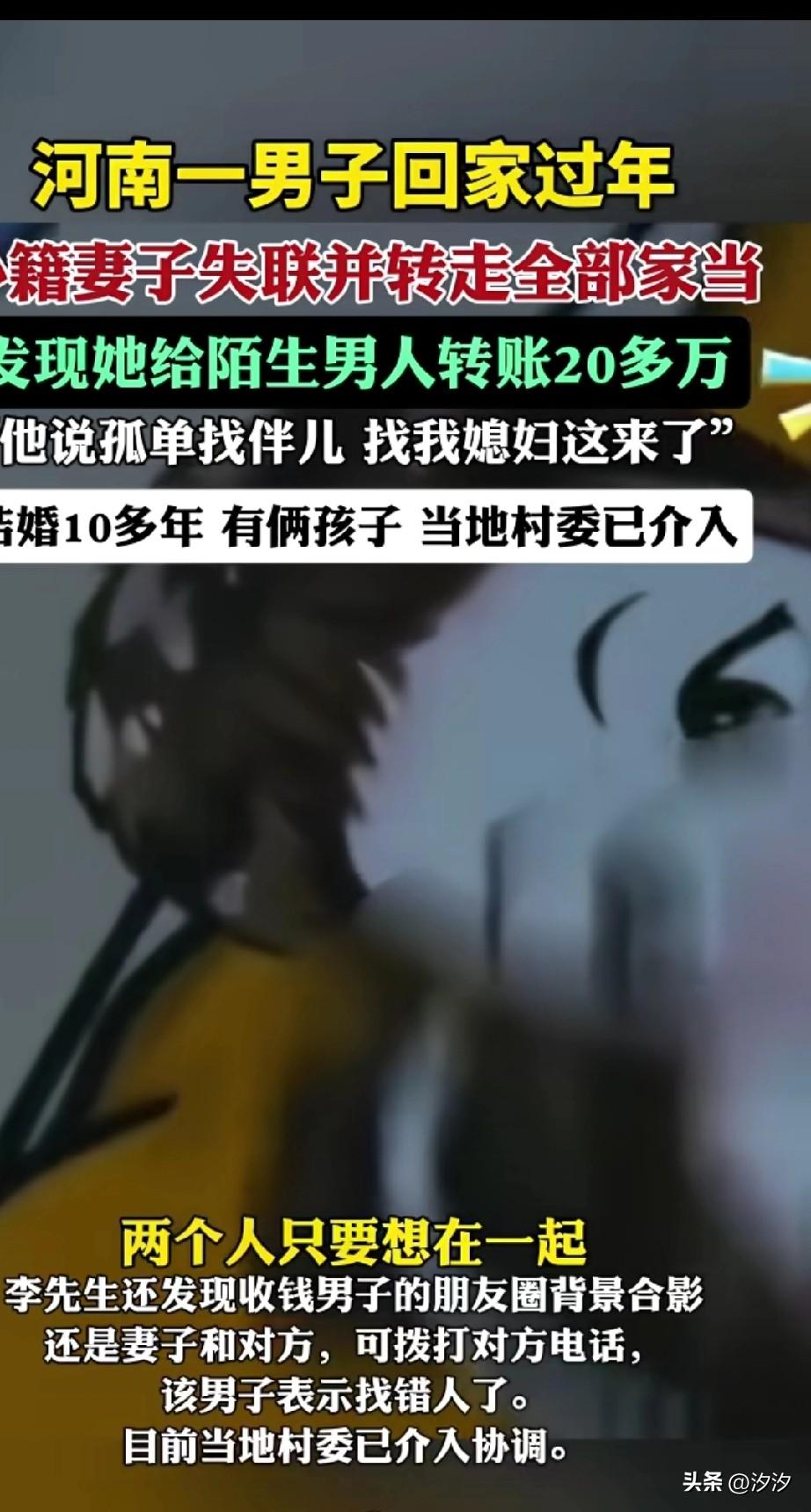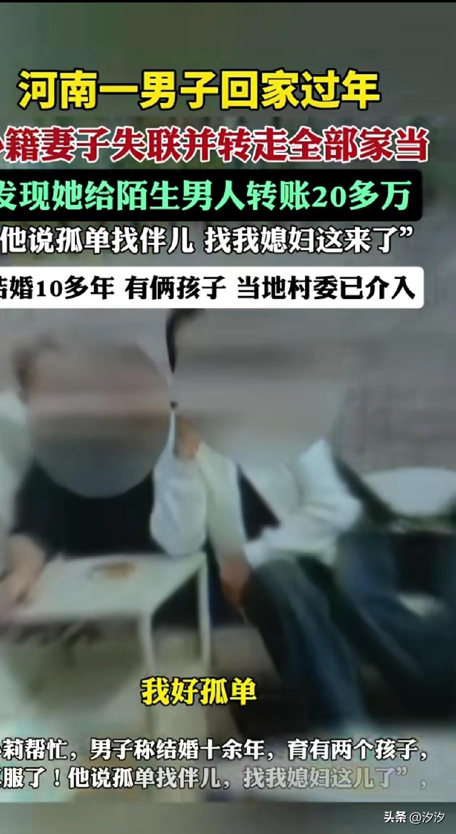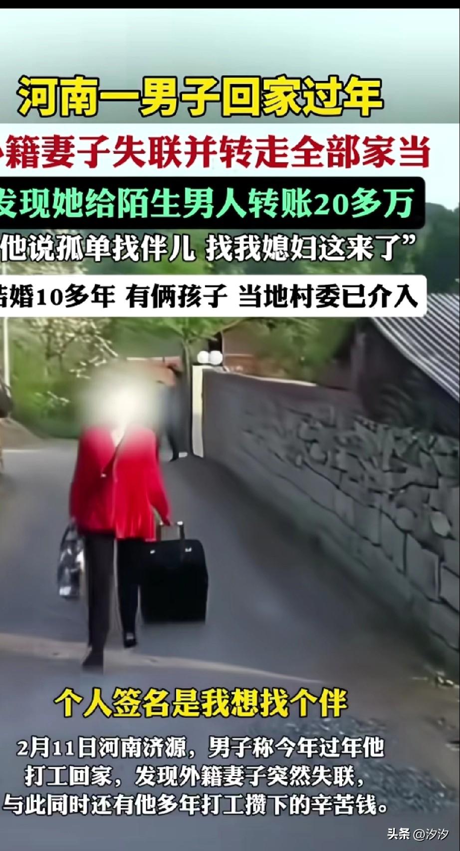 河南济源的一男子过年回家, 发现自己的外籍妻子失联, 并转走了他的全部家当, 发现他给陌生男子转款20万, 两个人结婚10多年, 有两个孩子, 后来通过媳妇儿的朋友圈背景, 发现那个人居然是同村的, 那个男子的微信签名, 居然是孤单找伴, 结果找他媳妇儿这儿了, 于是拨打了对方的电话, 结果对方就说找错人了, 目前村委会已介入, 男子辛苦出去打工赚钱, 没想到外籍妻子会来这一手。 因为自己的外籍妻子会好好顾家, 没想到人家孤单寂寞, 被陌生人三言两语就带走了, 陌生男子还是通过他媳妇儿发的抖音, 认识他媳妇儿的, 都说老外开放, 你们还不信? 这下直接实锤, 这样的跨国恋你们喜欢吗? 河南 跨国恋幸福吗?