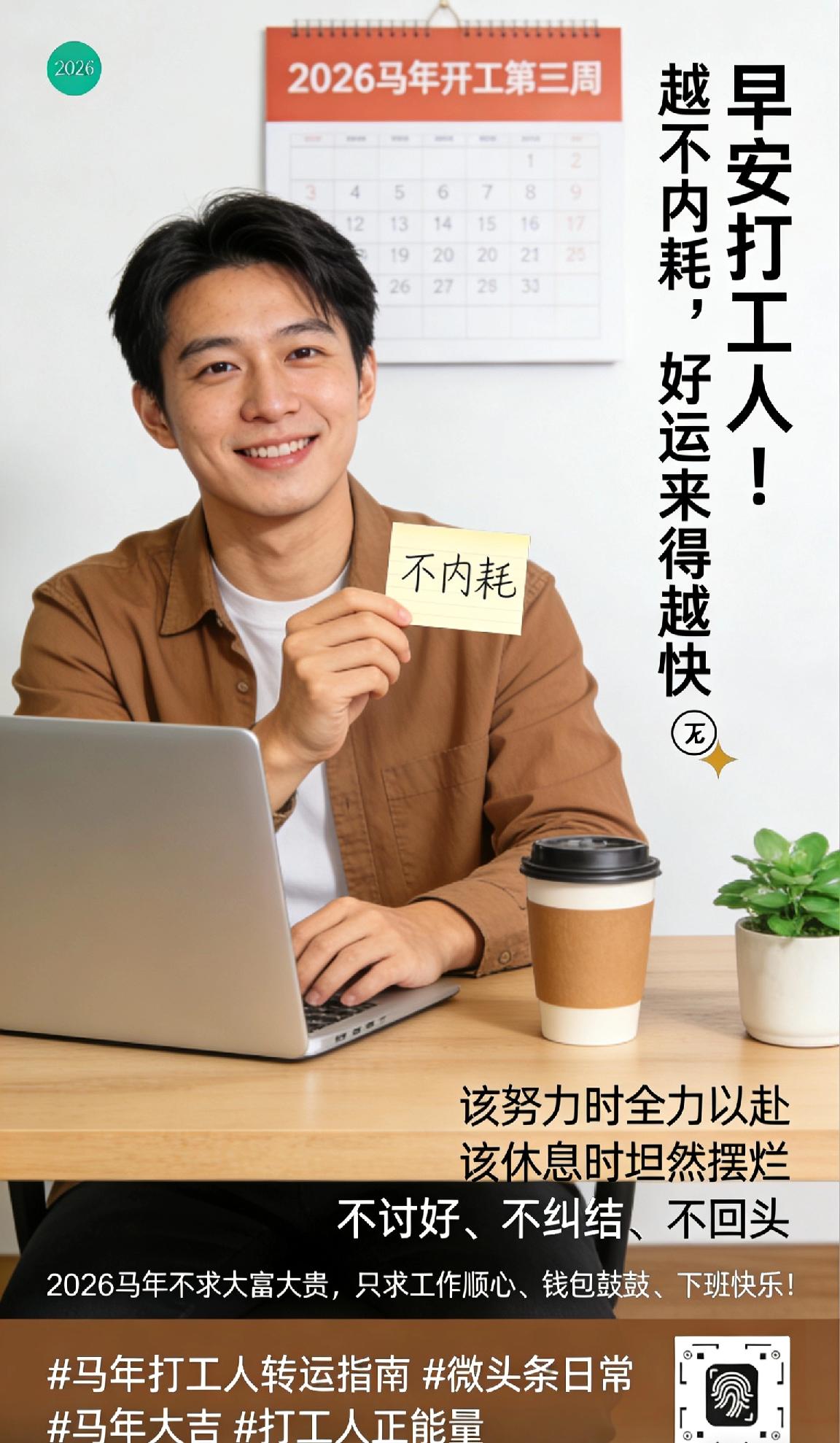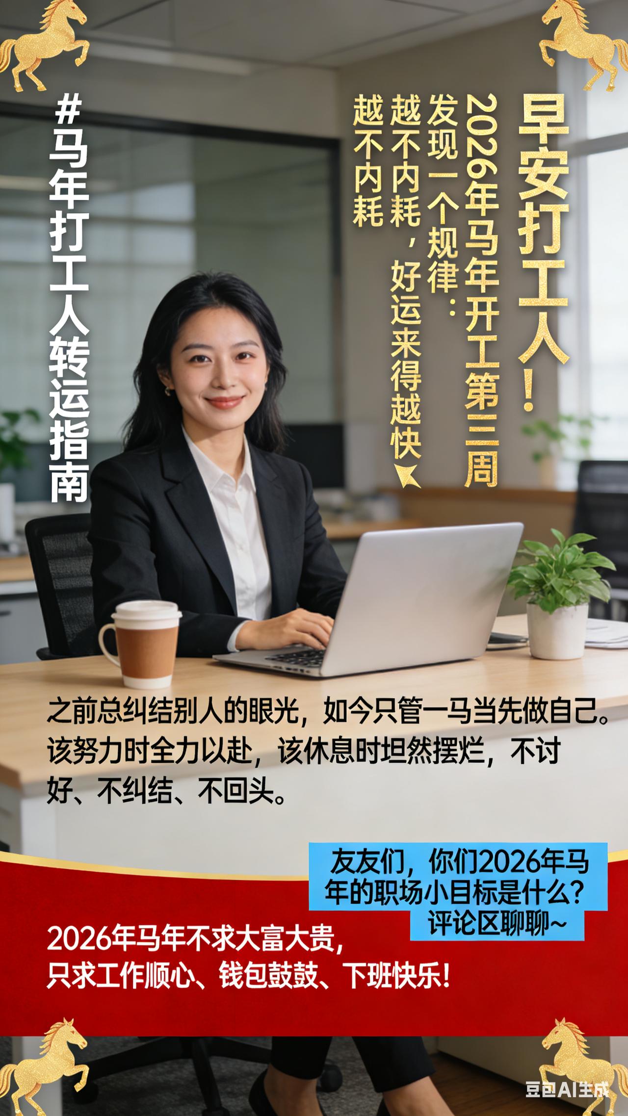 早安打工人!马年开工第三周,发现一个规律:越不内耗,好运来得越快✨ 之前总纠结别人的眼光,如今只管一马当先做自己。该努力时全力以赴,该休息时坦然摆烂,不讨好、不纠结、不回头。 果然,当你把精力放在自己身上,麻烦会自动绕道,机会会主动敲门。马年不求大富大贵,只求工作顺心、钱包鼓鼓、下班快乐! 友友们,你们马年的职场小目标是什么?评论区聊聊~ 马年大吉