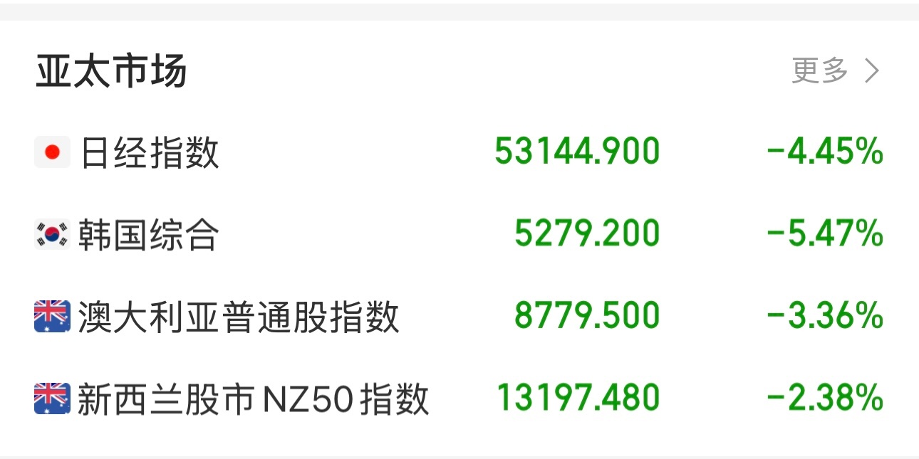 亚洲已经有很多国家股市开盘了。日本股市目前跌4.45%。韩国股市目前跌5.47%。澳大利亚目前跌3.36%。新西兰股票目前跌2.38%。这次全球股市大跌,主要是因为美以打伊朗引起的石油危机导致的股市大跌。特朗普是股市下跌的罪人。
