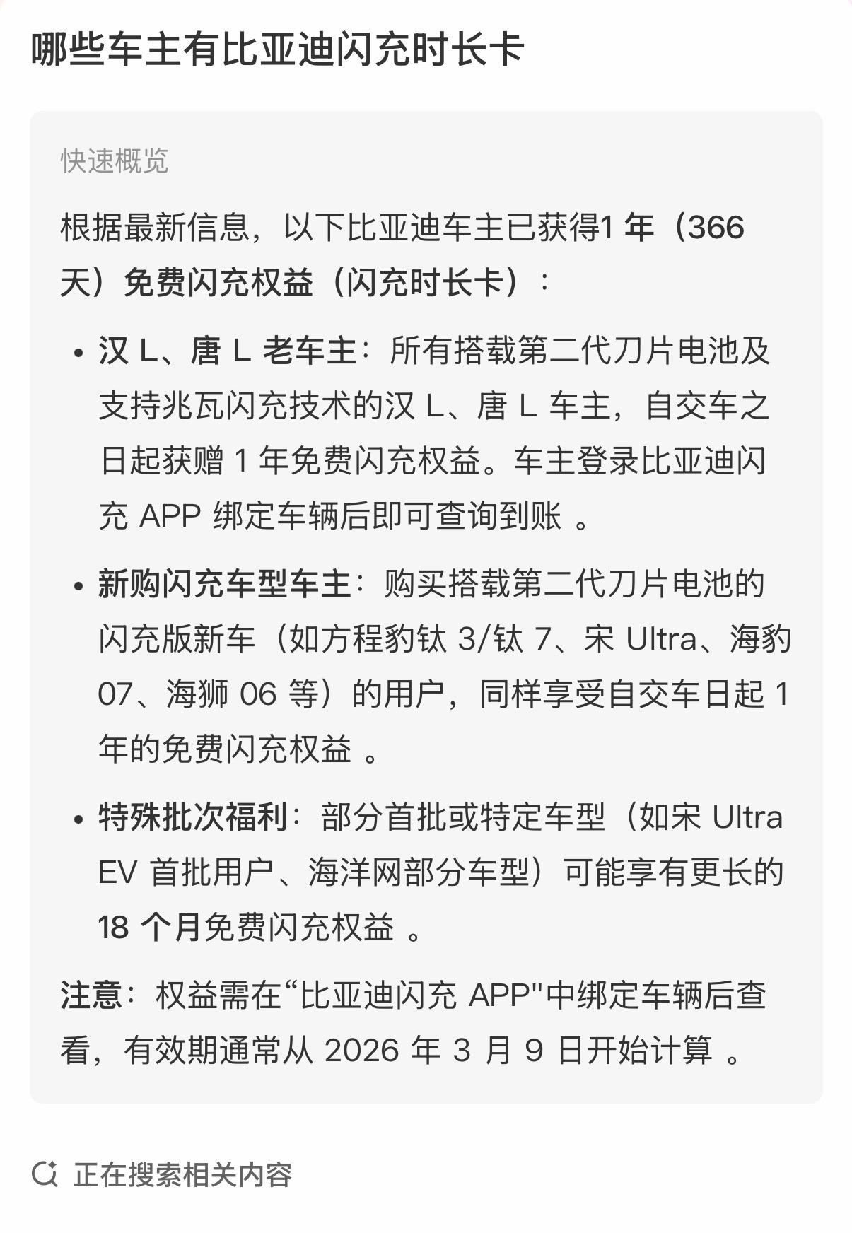 刷到一位比亚迪车主分享自己获得了一年免费闪充权益,查了一下是搭载第二代刀片电池及支持闪充技术的唐L、汉L车主都可以有,绑定闪充APP 后即可查询到赠送的366天免费闪充权益。 王总要是在发布会多说一句,得早高兴好几天😀