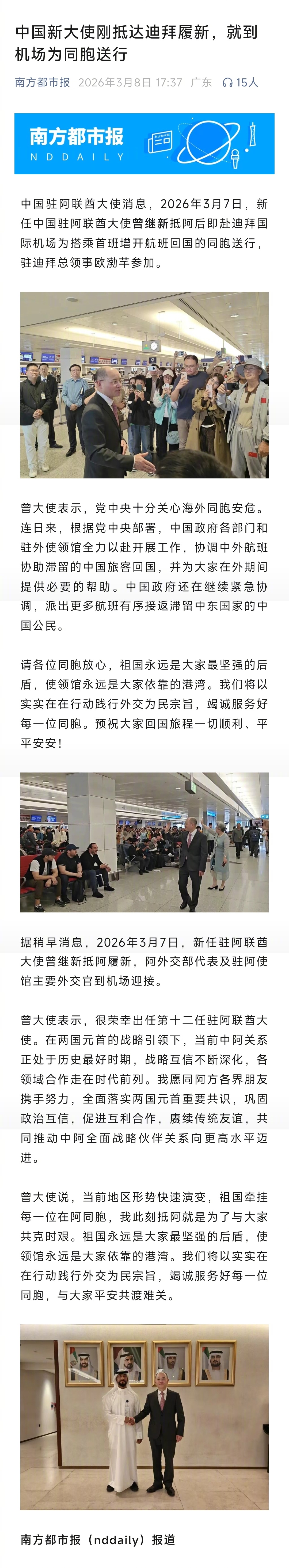 #中国大使刚上任就到机场送同胞回国#【中国新大使刚抵达迪拜履新,就到机场为同胞送行】#中国新大使到迪拜机场送同胞回国#中国驻阿联酋大使消息,2026年3月7日,新任中国驻阿联酋大使曾继新抵阿后即赴迪拜国际机场为搭乘首班增开航班回国的同胞送行,驻迪拜总领事欧渤芊参加。
