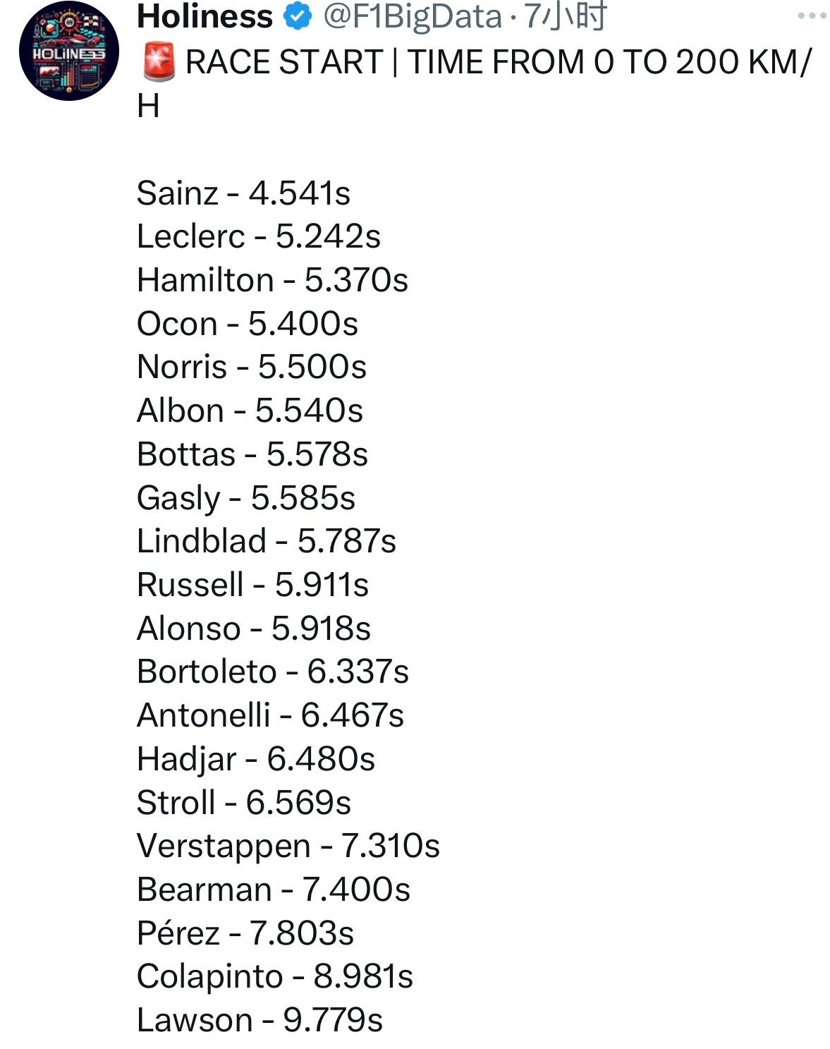 澳大利亚大奖赛正赛起步0-200km/h耗时,塞恩斯最快,勒克莱尔汉密尔顿分列二三