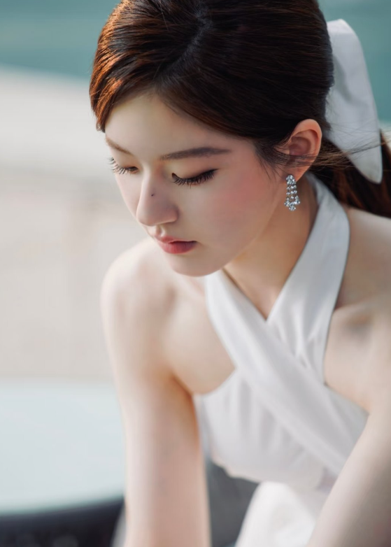 景甜舍弃了繁复的珠宝,仅佩戴珍珠耳环作为点缀