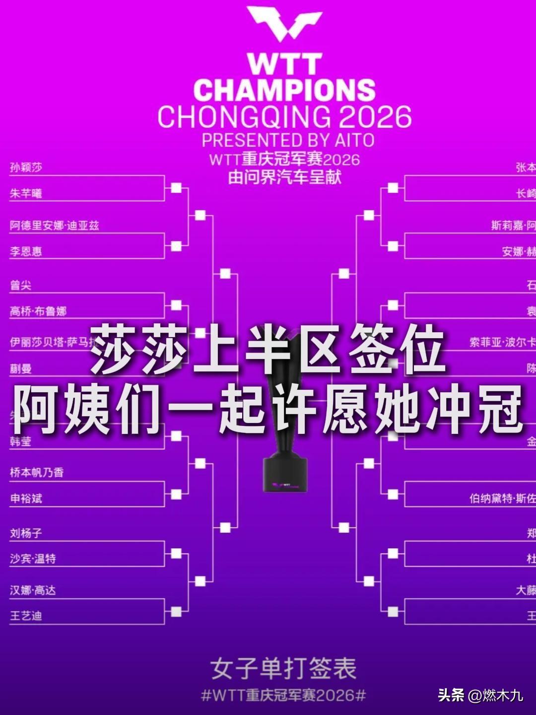 重庆签表出炉,莎莎上半区签位 阿姨们一起许愿她冲冠 姐妹们,重庆冠军赛签表出炉啦!莎莎上半区首轮对朱芊曦, 签位看起来不错,阿姨们开心~ 但短局制残酷, 同区还有韩莹、桥本帆乃香这些特殊打法, 得场场全力拼! 心疼莎莎,这孩子责任重, 但她最稳! 粉丝都说这个签位好兆头, 今年旺哦~ 妈妈粉扣1, 一起许愿她健康平安、继续冲! WTT重庆赛程 WTT女单签表 WTT重庆夺冠