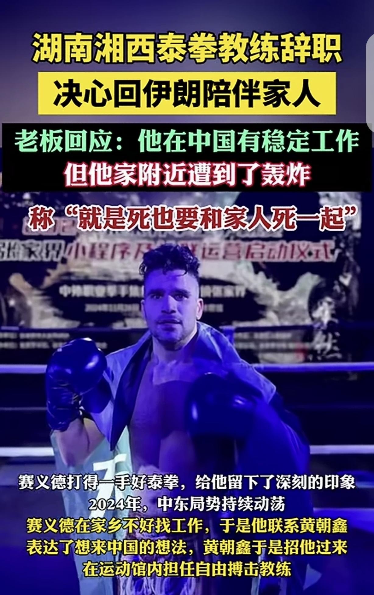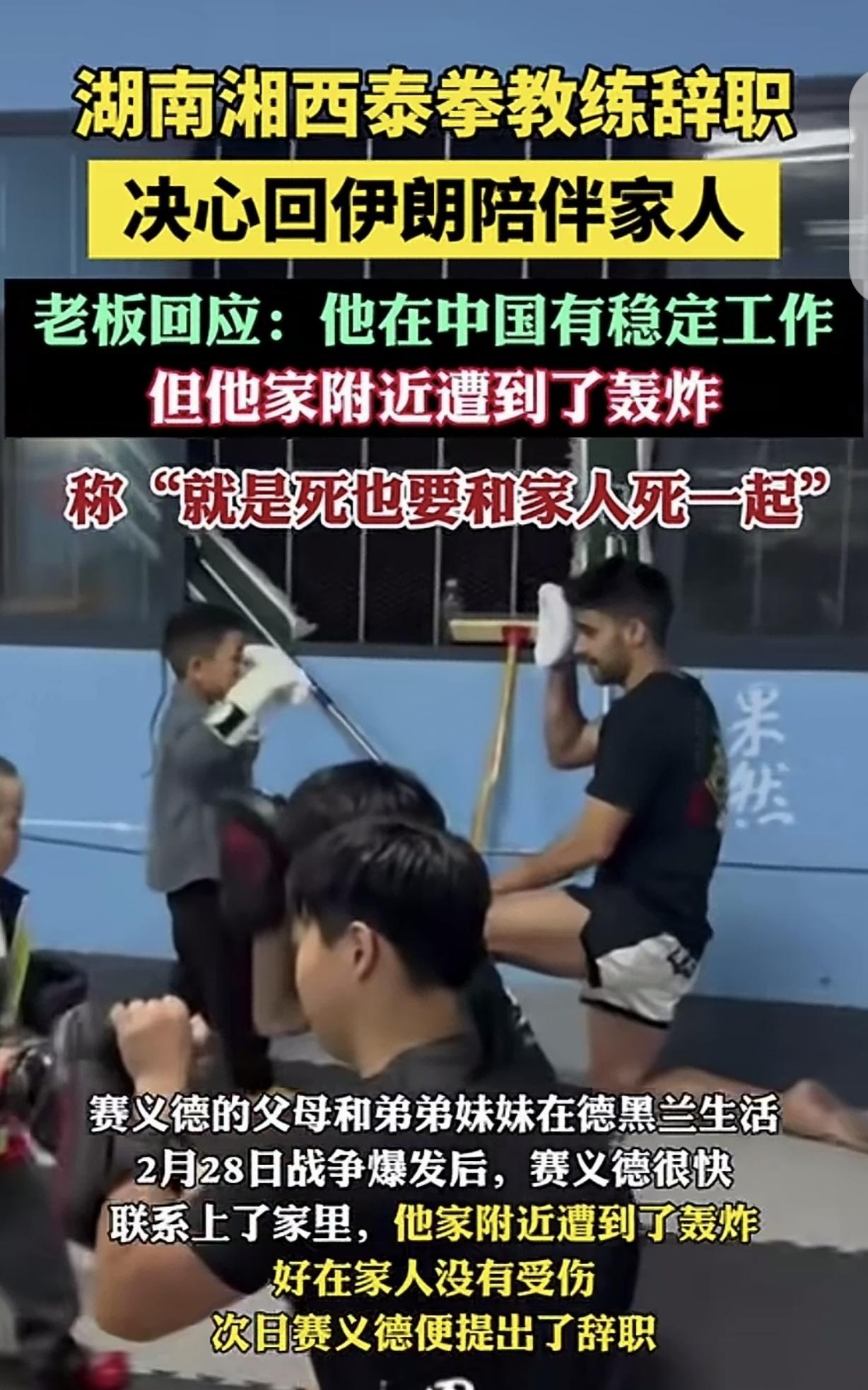 “我敬你是条汉子!”湖南湘西,一33岁男子是伊朗人,2024年中东局势动荡,他找不到工作,就来中国在运动馆做搏击教练,2026年战争爆发,他的父母和弟妹都在家乡遭受轰炸,好在没受伤,男子放弃稳定的工作和收入,提出辞职,别人都想从伊朗跑出来,他却要向死逆行,回家陪伴家人,说:就是死也要和家人死一起。男子临走前的一句承诺,让人泪奔。 黄先生开了一家运动馆,里面有位来自伊朗德黑兰的搏击教练赛义德。 33岁的他,原本在伊朗德黑兰生活,可2024年中东局势动荡不安,家乡的工作机会越来越少,生活也变得艰难起来。 赛义德有一手厉害的泰拳功夫,2016年他在泰国打拳时,结识了运动馆的负责人黄先生。 黄先生被他的拳技深深吸引,一直记在心里。 当中东局势愈发糟糕,赛义德为工作发愁时,他想到了黄先生,便主动联系,表达了想来中国发展的想法。 黄先生很爽快,立刻邀请他来湘西,在运动馆担任自由搏击教练。 来到中国后,赛义德凭借出色的拳技和认真的教学态度,很快在运动馆站稳了脚跟,有了稳定的工作和收入。 他努力适应着在中国的生活,把这里当成了自己的第二个家。 而他的父母、弟弟妹妹则留在德黑兰,虽然相隔万里,但一家人时常通过电话、视频联系,互报平安。 然而,平静的生活在2026年2月28日被打破。 这一天,战争爆发了,德黑兰陷入了一片混乱。赛义德心急如焚,第一时间联系了家里。 得知家附近遭受了轰炸,他整个人都懵了,好在家人没有受伤,这才让他稍微松了一口气。 但赛义德的心始终悬着,他放心不下远在战火中的家人。仅仅过了一天,他就向运动馆提出了辞职。 他心里满是愧疚,一直跟黄先生说对不起,可他实在没有办法,战争爆发了,他必须回家陪伴家人,哪怕要面对死亡,也要和家人死在一起。 黄先生被赛义德的勇气和担当深深打动,他不仅没有责怪赛义德,还为他购买了回国的机票。 离开前的那几天,赛义德吃不下饭,睡不着觉,满心都是对家人的担忧和对中国的不舍。 3月5日,黄先生送赛义德去高铁站。相识十年的好友即将分别,两人都红了眼眶。 赛义德一步三回头,他知道在中国有稳定的生活,但他更清楚,家人在战火中需要他。 他跟黄先生承诺,如果战争结束,家人都平平安安,他一定会再回到中国,回到这个让他感到温暖的地方。 有人说,什么叫:爱家、爱国?这外男子在骨子里就体现出了!这就是家人的意义吧?换我也会这样做, 危难时刻离家人更近一点。 本来挣钱就是为了养家,如果家没了工作的意义也就没了,回家是最好的选择,不愿苟活,死也要死在故土上死在家人身旁! 回去才是一个男子汉的担当,如果一个国家的男人没了担当,那就是跪下了。 但有人认为,不该回去,在动荡时期,保全自己也是给亲人们有个退路,可去地方。 赛义德的选择,是无数人在危难时刻都会有的本能反应。当家人被战火裹挟,所谓的稳定工作、安稳日子,在亲情面前都显得没那么重要了。 他选择回去,不是不怕死,而是比起独自苟活,他更想和家人一起共渡难关,哪怕是面临死亡,也不想留下“家人在受难,自己却远在他乡”的遗憾。 有人说该保全自己,给家人留条后路,这话也没错。毕竟活着才有希望,万一有意外,至少还能撑起家里的未来。 但对于赛义德来说,他的担当就是奔赴家人身边。在他看来,钱是赚不完的,可家人的陪伴和守护,一旦错过就是永远。 这场选择没有对错之分,只是每个人对于“家”的意义理解不同。 有人把活下去当成给家人的希望,有人把和家人在一起当成最终的归宿。 赛义德的行为,让我们看到了亲情最质朴的模样,那就是无论多危险,家人永远是心里的牵挂,是值得用一切去守护的存在。 对此,你怎么看?