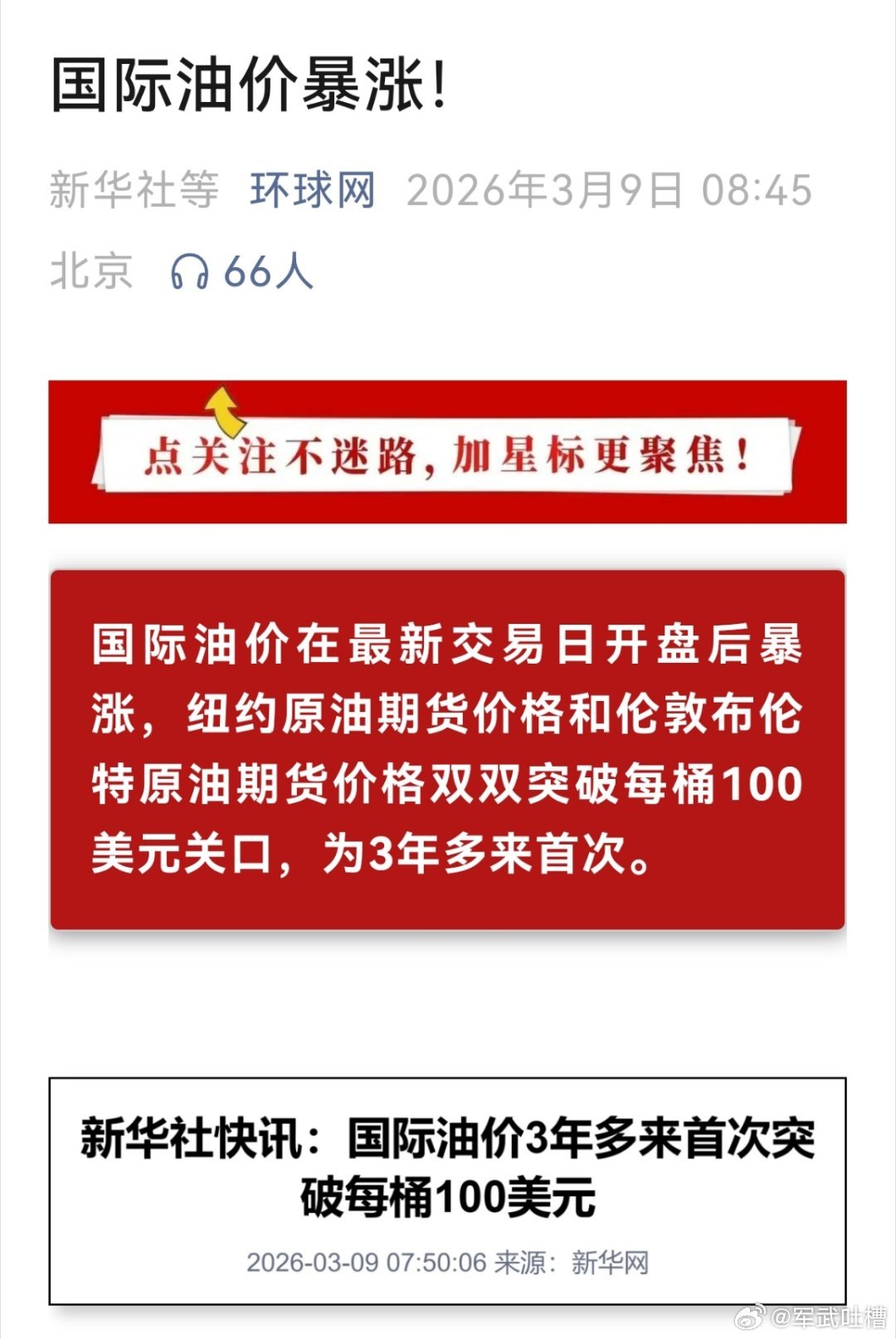 兄弟们,国际油价突破100美元了利好中国新能源汽车国际油价7年来首次突破100美元伊朗称击毁4部美军萨德系统雷达美伊以冲突
