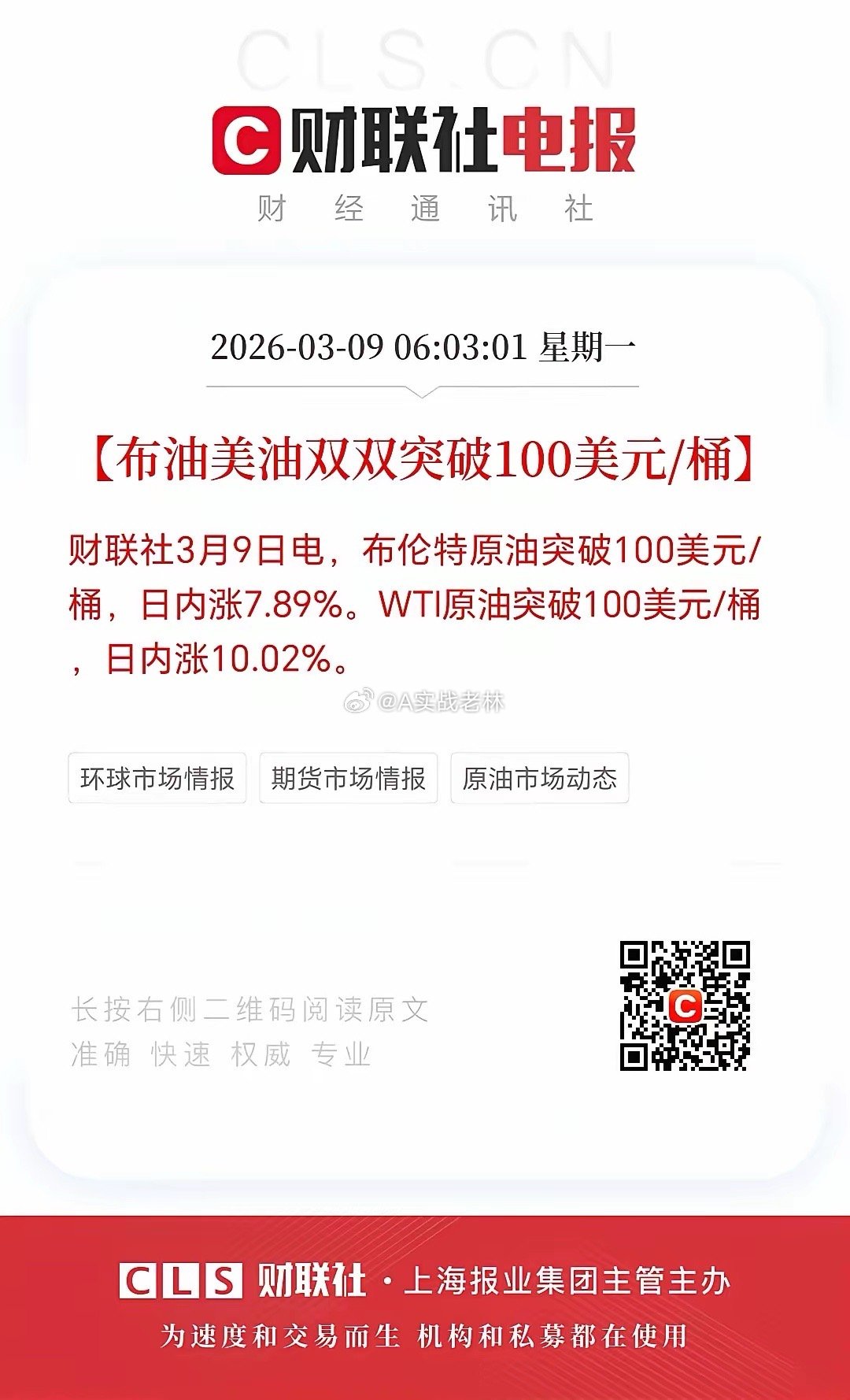 原油价格疯涨,已经突破100美元!消息一出,早上日韩股市直接低开,韩国已经下跌超过5%。油价疯狂背后,地缘冲突让中东石油生产和运输受阻,原油价格一路狂飙,布伦特原油盘中达111.04美元,WTI原油也创111.24美元高价。原油短期连续大涨,波动风险加剧。而黄金也没逃过,开盘走低。日韩股市这一开局,就像被原油价格狠狠踹了一脚,直接“投降”。不过对咱大A虽有影响,但也不必过度悲观,机会或许就藏在回调里。 这里,关注油价上行收益的主线,同时也可留意油价上涨影响较小的行业,比如AI先进制造业等!