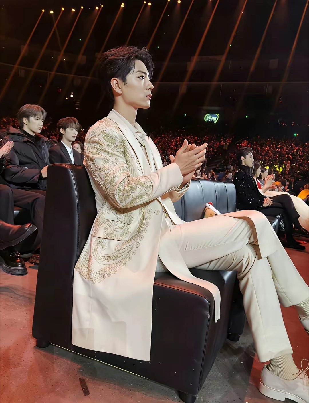 肖战这套白色披风西装造型真的鲨疯了!奶白色西装搭配鎏金镶边披风,袖口的碎钻点缀,