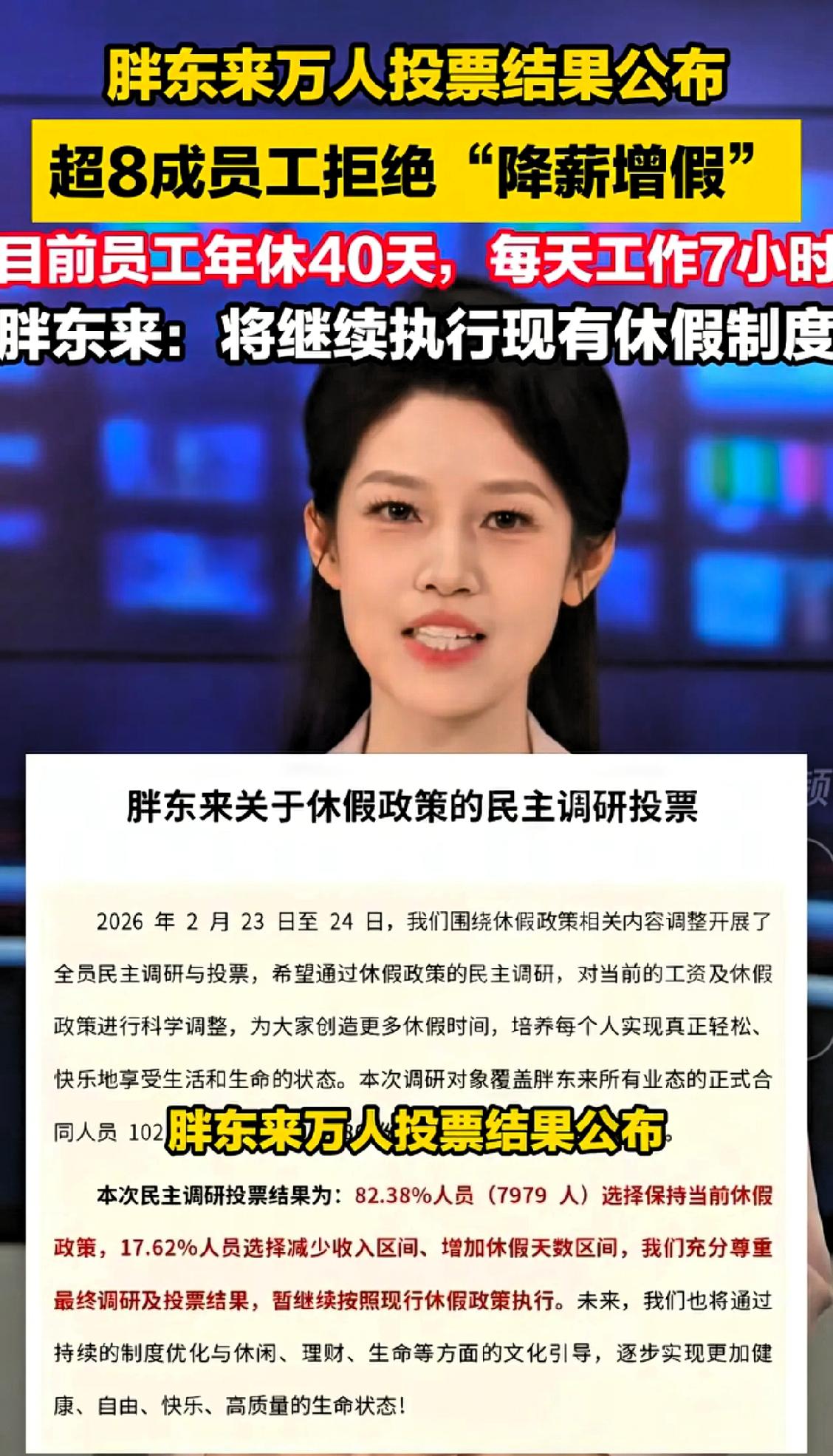 胖东来万人投票结果公布,超八成员工拒绝降薪增加。 胖东来目前实行每日7小时工作制,同时为员工提供每年40天的带薪假期,整体工作与休假安排在行业内较为完善。此次调研是企业为了解员工需求,征询大家是否愿意通过调整薪资来增加休假时长,数据同时显示,超97%的员工对现有的休假安排表示满意。 多数员工选择维持现状,反映出普通职场人务实的生活考量。在日常生活中,各类固定开支与生活成本构成了现实压力,稳定的薪资收入是保障生活质量的基础,相较于增加假期,大家更倾向于保留现有的薪酬水平。 这一选择也打破了部分人对职场人一味追求更多假期的固有认知,合理的休息与稳定的收入同等重要,多数人更希望二者保持平衡,而非牺牲其中一项换取另一项。 胖东来在得知调研结果后,表示将尊重员工的选择,继续执行现行的工作与休假制度。企业主动调研员工需求,并且依据员工意愿调整决策,体现了较为人性化的管理思路,也让员工的意见得到切实重视。 从这一事件也能看出,优质的职场福利并非单一维度的倾斜,而是兼顾收入与休息,贴合员工实际生活需求。对于多数普通职场人而言,稳定的收入、适配的休息时长与被尊重的工作环境,是更为实际的诉求。 企业站在员工角度考量问题,员工理性做出适合自身的选择,这种双向的务实与理解,才是构建良好职场环境的关键。
