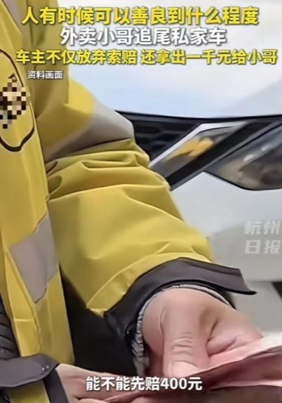 “人究竟可以善良到什么程度?”浙江杭州,外卖小哥凌晨追尾一辆汽车,恳求车主:“能不能别报案,我刚从湖南来杭州几天,跑外卖还没赚到钱,我先赔你400,剩下的慢慢还!”而车主的反应,让外卖小哥泪目了! 2026 年早春的江南,凌晨的寒意总裹着薄雾。 几组跨越苏杭郑三地的凌晨事件,没有惊天动地的剧情,却被同一种重量串联 —— 四张皱巴巴的百元钞,或是三百元的零钱。 这些不足五百元的现金,在深夜的街头,成了普通人担当与体谅的见证,也成了一座城市温度的刻度。 故事的起点,落在苏州工业园区的星湖街。 2026 年 2 月下旬的凌晨两点,路灯的光晕里,外卖骑手何师傅的电动车猛地撞上了等红灯的私家车。 他跳下车时,手心全是汗,先看清了私家车后保险杠十厘米的划痕,再摸出了口袋里仅有的四百元。 那是他攒了半个月,准备给女儿交幼儿园学费的定金,每一张都被压得平整。 “大姐,我全责,这四百您先拿着,不够我再想办法。” 何师傅的安徽口音里带着慌张,眼睛却没离开车主的脸。 车主是位做会计的大姐,她蹲下身看了看划痕,又瞥到何师傅手机屏幕上跳动的订单超时倒计时。 “划痕不重,走保险就好。” 她没接钱,递出一张名片,“先去送单吧,凌晨骑车别总盯着手机。” 何师傅后来回忆,那四百元他攥了一路,送到最后一单时,指尖还在发麻。 三天后的杭州,元宵节的灯火还没熄灭,凌晨一点半的建国南路,90 后创业者张中停刚停稳车,就被 “砰” 的一声巨响惊到。 散落的外卖餐盒、开裂的电动车前脸,还有蹲在车尾发抖的年轻小伙,构成了现场最扎眼的画面。 这位不到二十岁的湖南小伙小陈,来杭州才三天,这是他跑的第五单外卖。 他从工装口袋里掏出四百元,纸币上沾着外卖汤汁和手心的汗,声音抖得不成调:“哥,别报警,我没赚到钱,这四百是我全部的积蓄,剩下的我打欠条,每天跑通宵还你。” 张中停绕车一圈,看到被撞坏的车尾雷达,心里清楚维修至少要几千元。 但当他对上小陈冻得发紫的嘴唇和泛红的眼眶,瞬间收起了刚要拨通的报警电话。 “如果这是我的弟弟,在外遇到难处,我也希望有人拉一把。” 张中停的这句话,后来被千万网友转发。 他不仅拒收了那四百元,还从车里拿出一个提前准备的红包,把一千元硬塞进小陈口袋,“拿去修电动车,吃顿热乎饭”。 小陈愣了半分钟,对着他深深鞠了一躬,眼泪砸在冰冷的路面上。 这段行车记录仪视频,成了元宵节最暖的刷屏内容。 杭州的暖意,还在延续,3 月 5 日凌晨三点,临平区星光街的监控画面里,又一起撞车事故发生了。 外卖骑手小周的电动车,撞上了路口停放的私家车。 他的胳膊擦破了皮,车把歪成了九十度,而私家车的车尾,多了一个拳头大的凹陷。 这位刚来杭州五天的湖南小伙,租住在三百元一个月的隔板房里,那四百元是他省了三天饭钱攒下的。“求您别报警,我不想丢了这份工作。” 他攥着钱,低着头,不敢看车主的眼睛。中年车主没有接钱,反而从后备箱拿出碘伏,蹲下身给小周处理伤口。 “凌晨三点还在跑单,肯定是为了生活。” 他帮小周掰正车把,递上一瓶矿泉水,“赶紧去送单,别超时了。” 监控里,小周骑出十米后,突然停下,对着车主的方向鞠了一躬。 这三起四百元的故事,让人想起郑州街头的另一场相遇。 凌晨五点的早市旁,外卖小哥撞坏了摊主的小吃车,他翻遍全身,凑出三百元,带着哭腔求摊主宽限几天。 摊主没收钱,反而从钱箱里拿出五十元,塞到他手里:“都是讨生活的,别为难自己。” 这四份零钱,承载着不同的重量:何师傅的四百元,是女儿的未来,小陈的四百元,是异乡的底气;小周的四百元,是三天的饥饿,郑州小哥的三百元,是全部的积蓄。 而那些车主和摊主,本可以依法索赔,却都选择了退让。 他们的善意,不是富有的慷慨,而是在自己的生活里,愿意给陌生人留一条退路。 张中停在采访中说,这件事让他更加坚定了把事业搬到杭州的想法,“这里的人,让我觉得温暖”。 事实上,这些凌晨的相遇,从来都不是偶然。 在苏杭郑的街头,这样的善意每天都在发生:公交司机等一等奔跑的路人,便利店老板给流浪汉递上热粥,邻居帮出差的住户代收快递。 凌晨四点的杭州,天渐渐亮了,第一缕阳光穿透薄雾,照在街头骑行的外卖骑手身上。 他们的电动车灯,在晨光里渐渐淡去,却把温暖留在了这座城市的每一个角落。 善良从来都不是什么壮举,它藏在四百元的重量里,藏在凌晨的街头,藏在每个普通人的将心比心里。 这份朴素的善意,就是人间最珍贵的底色。 如果各位看官老爷们已经选择阅读了此文,麻烦您点一下关注,既方便您进行讨论和分享,又能带来不一样的参与感,感谢各位看官老爷们的支持!