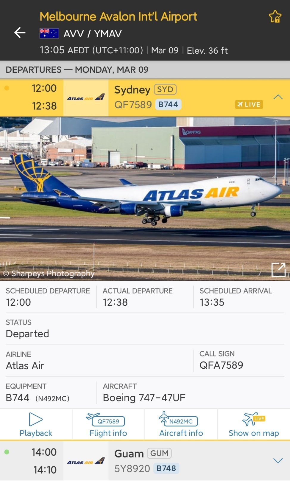 第一架飞行中✈️,阿特拉斯航空携带F1车队物资📦🏎在悉尼经停下将再次起飞前往上海浦东国际机场F1赛车2026F1中国大奖赛2026F1喜力中国大奖赛