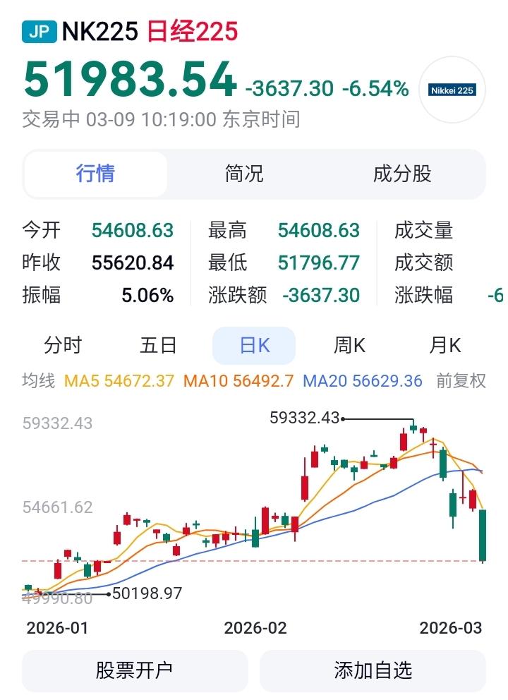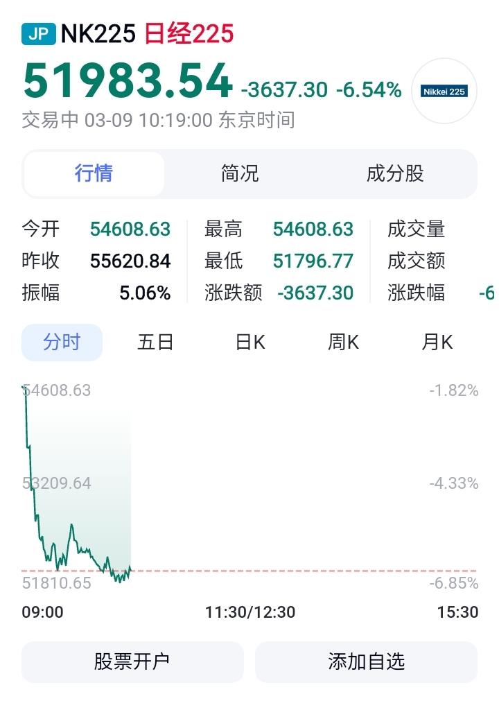伊朗有事,日本有事。 由于美以袭击伊朗,油价暴涨,日本股市今日开盘瞬间暴跌6.54%,创下川普贸易战以来最大单日跌幅。 日本绝大部分源由来自中东 自美以袭击伊朗以来日本股市已累计下跌了近13%。