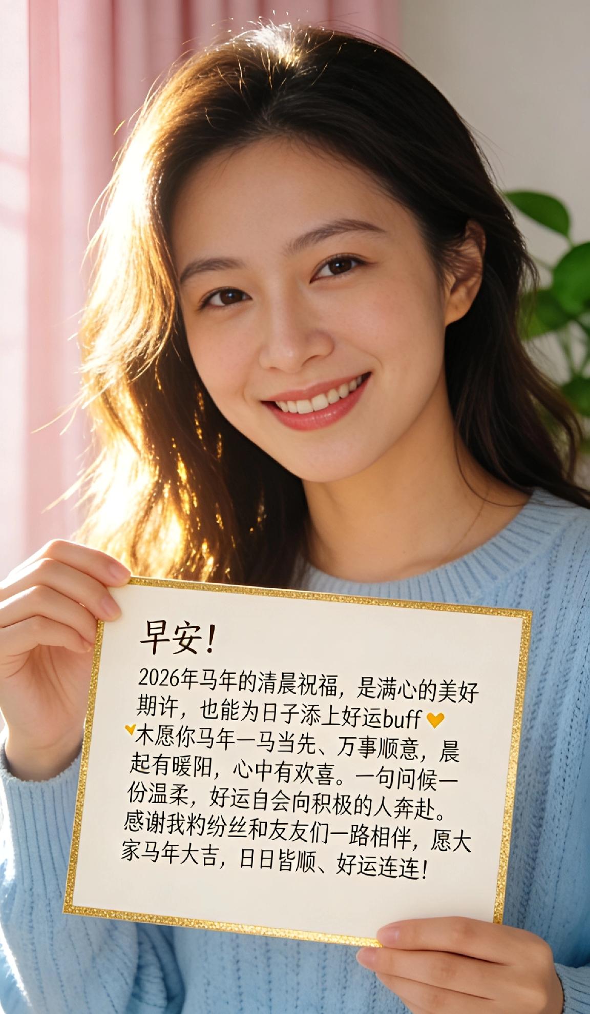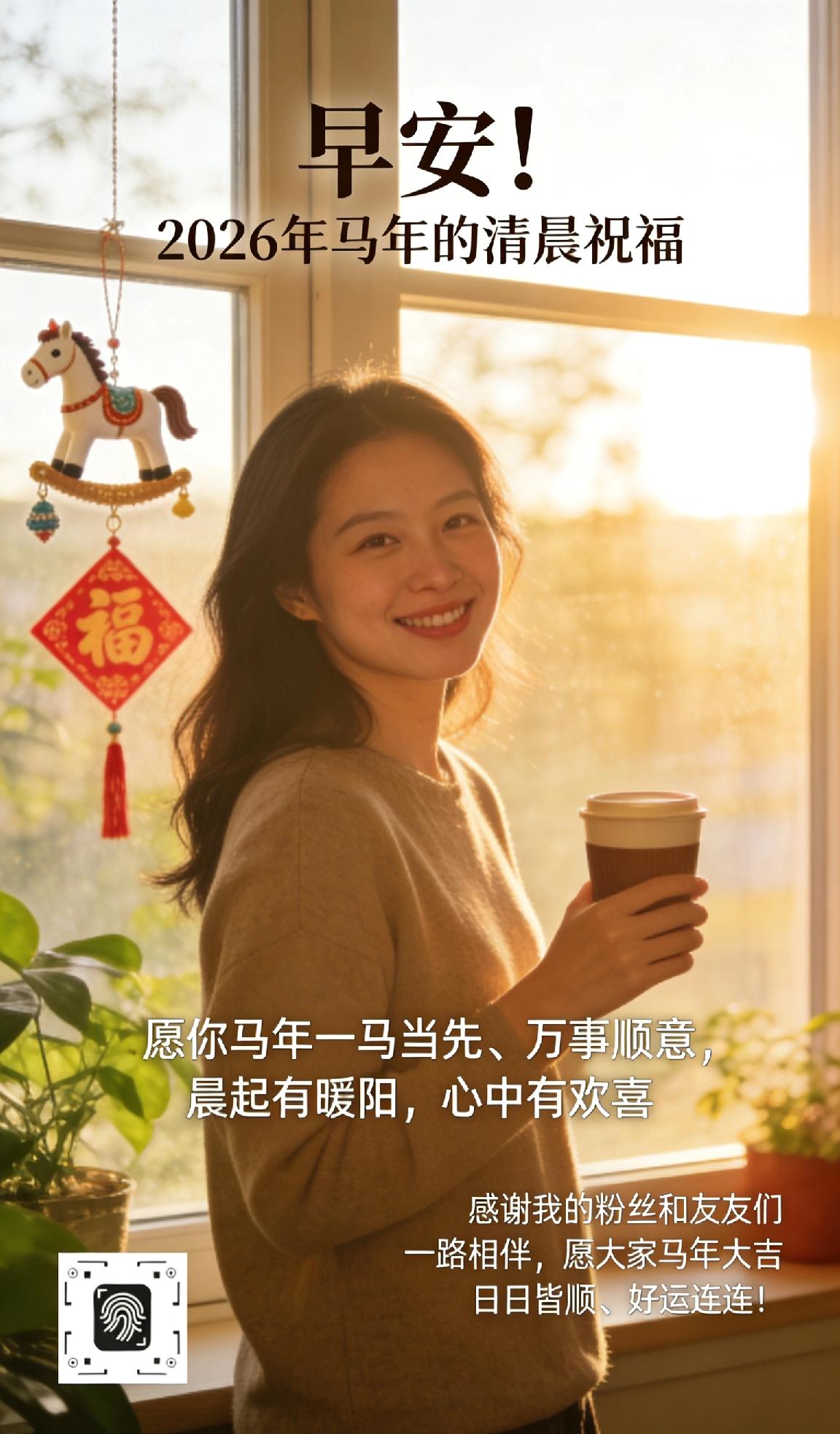马年的清晨祝福,是满心的美好期许,也能为日子添上好运buff✨愿你马年一马当先、万事顺意,晨起有暖阳,心中有欢喜。 一句问候一份温柔,好运自会向积极的人奔赴。感谢我的粉丝和友友们一路相伴,愿大家马年大吉,日日皆顺、好运连连!马年祝福语 马年新春祝福语