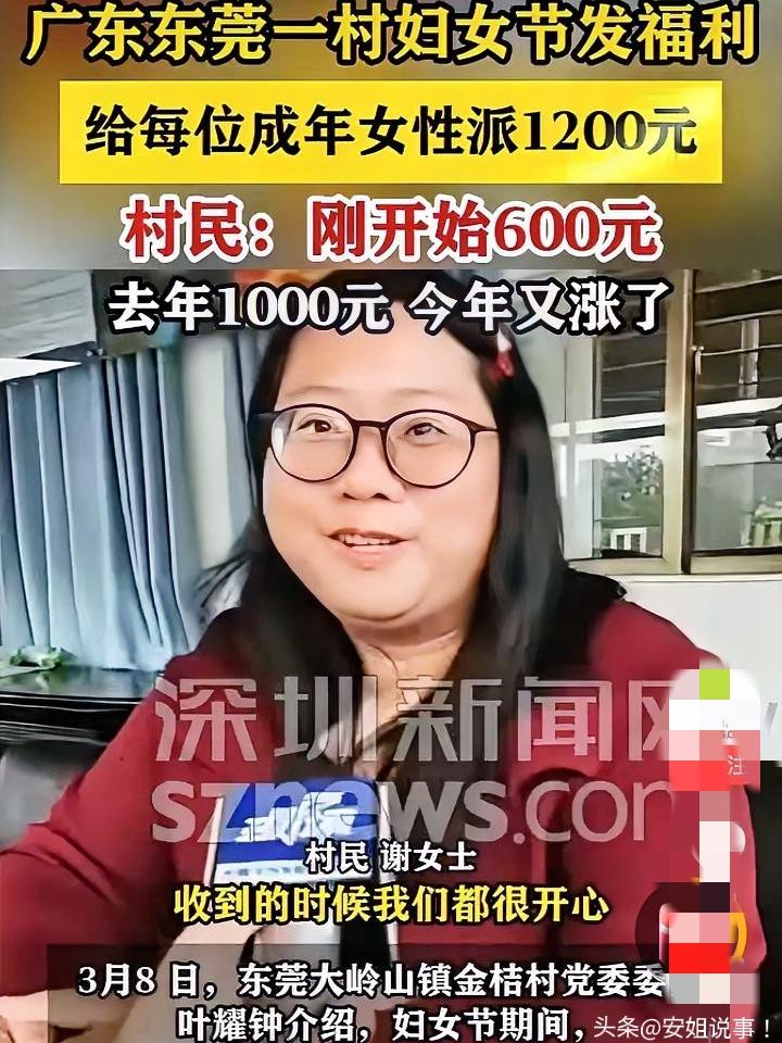 暖❤️!东莞金桔村妇女节红包刷屏!每人1200元年年涨…… 东莞大岭山金桔村的公告栏前,围满了前来查看妇女节福利的女性村民,红纸黑字的1200元慰问金通知,让现场满是欢声笑语。 村里的妇女节慰问金逐年递增,从最初的600元,到去年的1000元,今年直接上调至1200元,不少村民拿着通知反复核对,脸上满是笑意。 有村民现场清点刚领取的现金,盘算着用途:有人打算添置换季衣物,有人准备给家人买实用好物,还有人计划约上姐妹聚餐庆祝。 周边村落的福利也各有特色,有的派发米油粮油,有的发放定制礼品,村民们互相分享着福利照片,羡慕声与欢笑声交织在一起。 村委会的工作人员忙着核对发放名单,细心标注每一位领取人的信息,不少独居老人的名字旁,都被做了贴心标记,确保福利精准送达。 村头的休闲区里,女性村民们围坐闲聊,分享着红包的规划,路过的孩童听着长辈的对话,默默记下要给妈妈准备节日小惊喜。 你的家乡妇女节有哪些暖心福利?是现金红包还是实用好物?快来分享这份专属仪式感~ 东莞村级女神福利 妇女节暖心瞬间