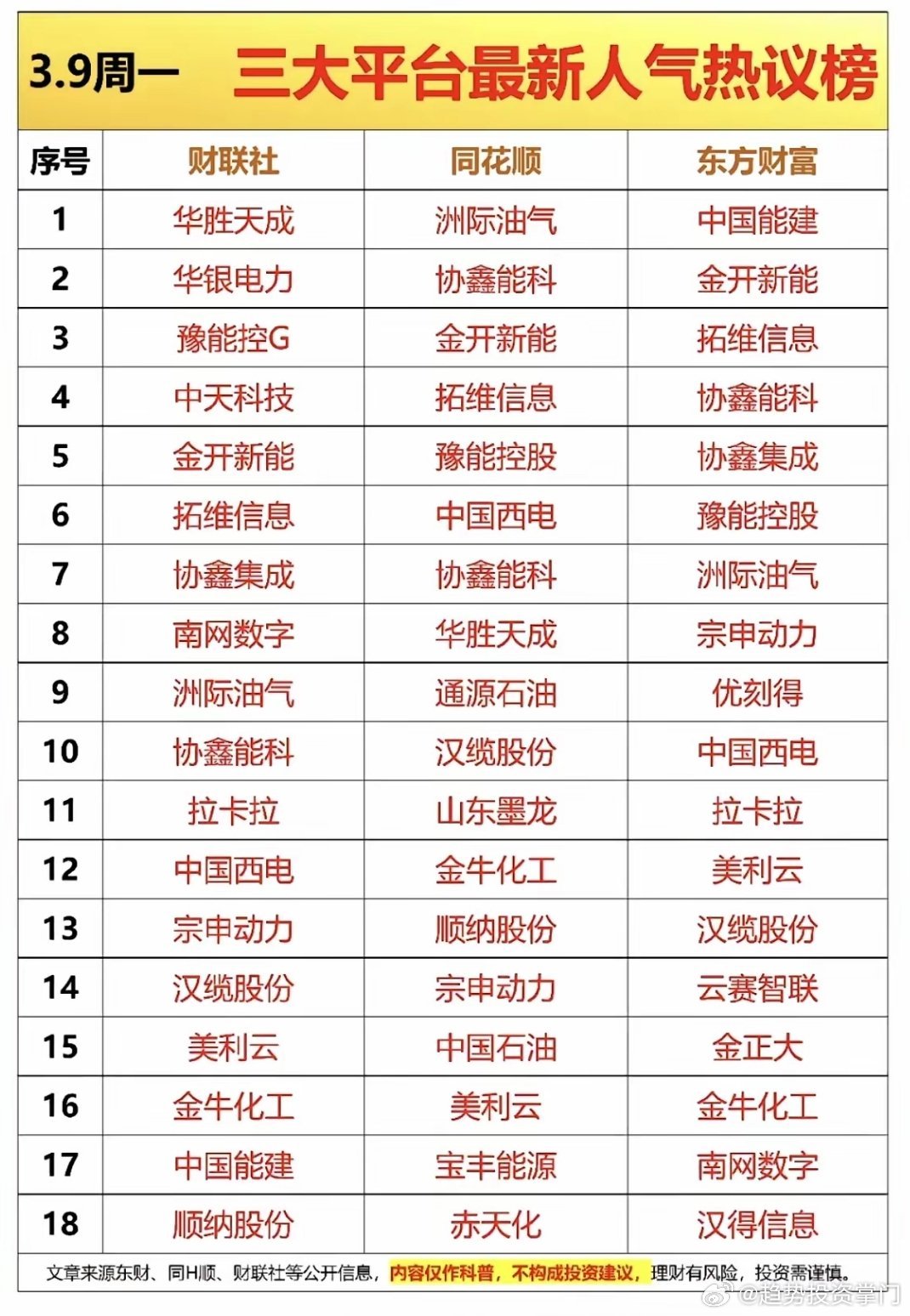 3.9周一 市场热点方向+人气热搜榜!1.华为昇腾,AI芯片替代2.算电协同3.OpenClaw龙虾智能体4.未来能源5.人工智能6.无人机7.油气、海运、化工甲醇、尿素、化肥相关核心龙头股: