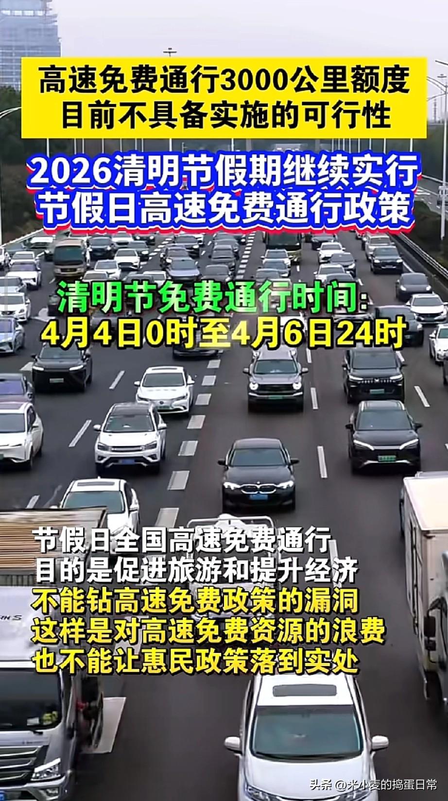高速免费3000公里额度,今年清明彻底没戏! 刚刷到消息,今年清明高速还是老规矩:4月4日0点到4月6日24点免费,那个传了好久的“全年免费3000公里”,直接被官方判了“不可行”。 说实话,我一开始也挺激动,想着以后自驾游能省不少钱。但冷静下来想,这事儿根本不现实。高速免费本来就是为了刺激节假日旅游、拉动经济,要是全年给额度,那大家都挑着免费时段跑,节假日堵成停车场,平时又空得慌,这不是浪费资源吗? 再说了,真要实施,谁来补这个巨大的资金窟窿?最后还不是羊毛出在羊身上?与其盼着这种不切实际的“大饼”,不如珍惜好清明这3天免费,错峰出行,别堵在高速上看风景。 你觉得高速免费3000公里这事儿,以后还有戏吗?